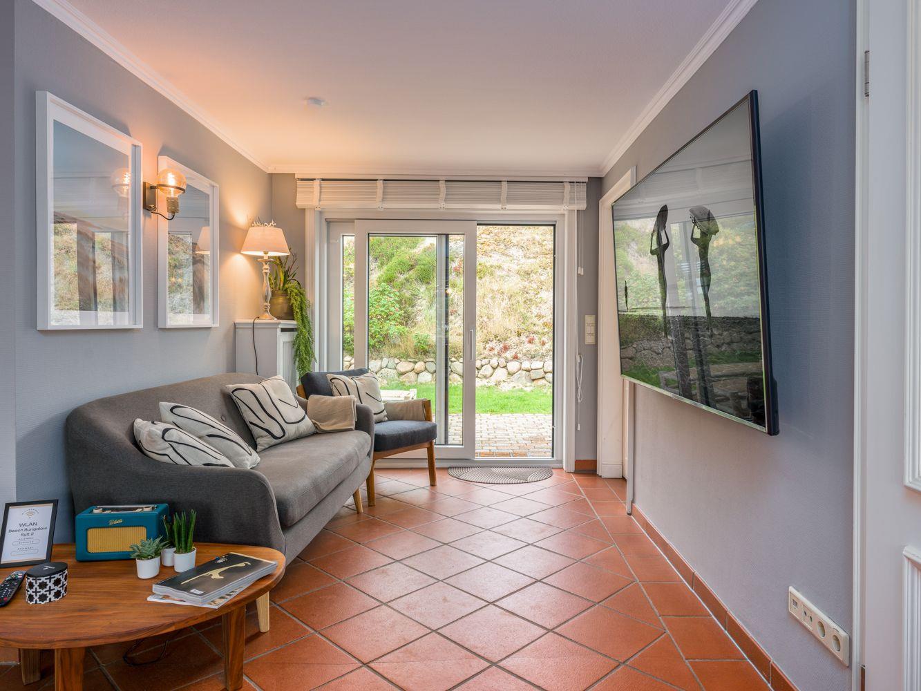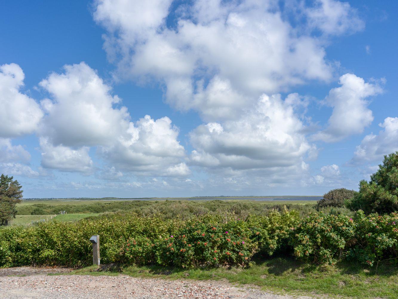 Die großzügige Terrasse mit Rasenfläche lädt zu entspannten Stunden im Freien ein. Ein privater Strandkorb steht für Sie bereit, damit Sie die frische Nordseebrise und die friedliche Umgebung voll auskosten können. Besonders einzigartig ist der erhöhte Essplatz, der über ein paar Treppenstufen zu erreichen ist und mitten in den Wildrosen und Dünen liegt – ein perfekter Ort, um das Frühstück mit Blick auf die raue Schönheit der Natur zu genießen oder den Abend in romantischer Atmosphäre ausklingen zu lassen.