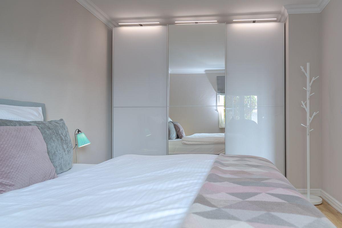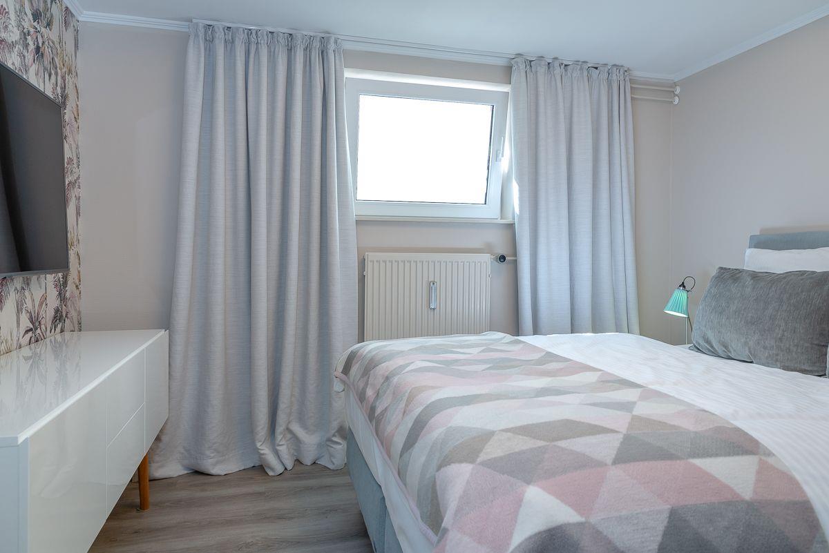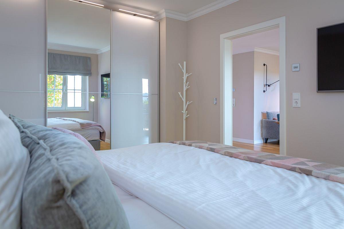 Zwei stilvolle Schlafzimmer mit hochwertigen Boxspringbetten sorgen für erholsamen Schlaf, ergänzt durch eine gemütliche Schlafcouch im Souterrain. Zwei elegante Badezimmer mit großzügigen Duschen bieten entspannte Wellness-Momente.