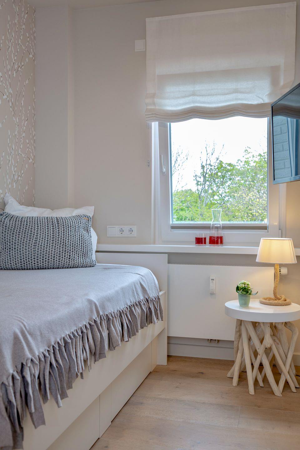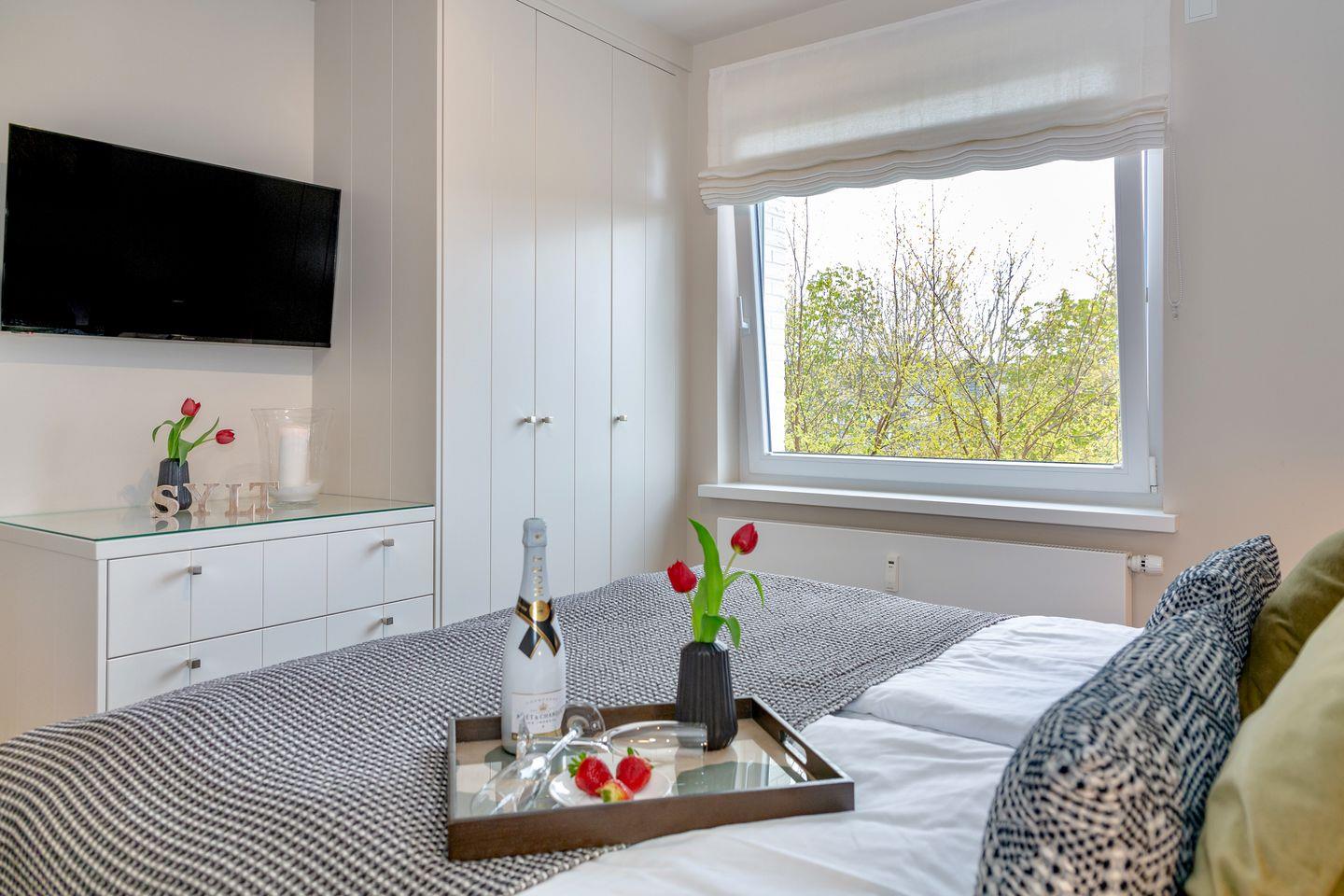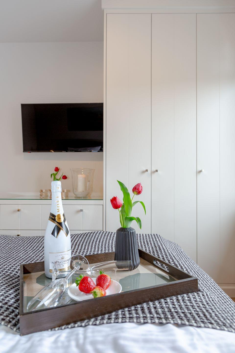 Ein Schlafzimmer ist mit einem komfortablen Boxspringbett und maßgefertigten Einbauten versehen und garantiert Ihnen dadurch entspannte Nächte. Das zweite Schlafzimmer überzeugt ebenfalls durch seine Einbauten und ist mit einem komfortablen Einzelbett ausgestattet. In Ihrem neu gefliesten Badezimmer mit bodentiefer Dusche werden Sie den Alltag hinter sich lassen und Ihre eigenen kleinen Wellness-Momente genießen können.