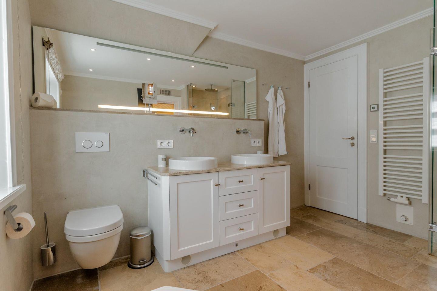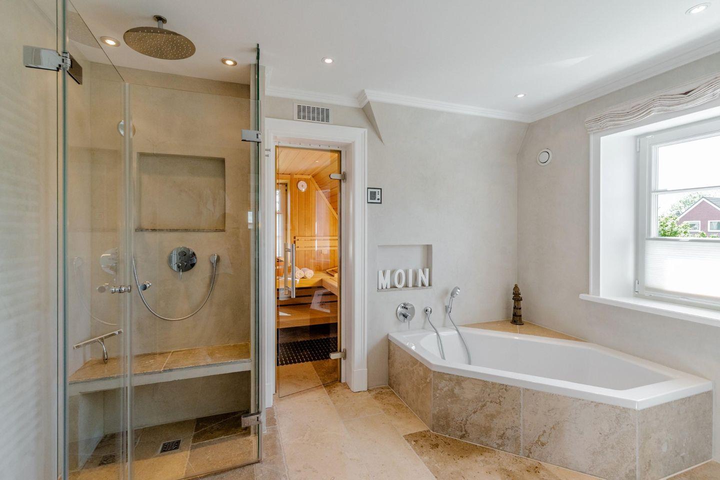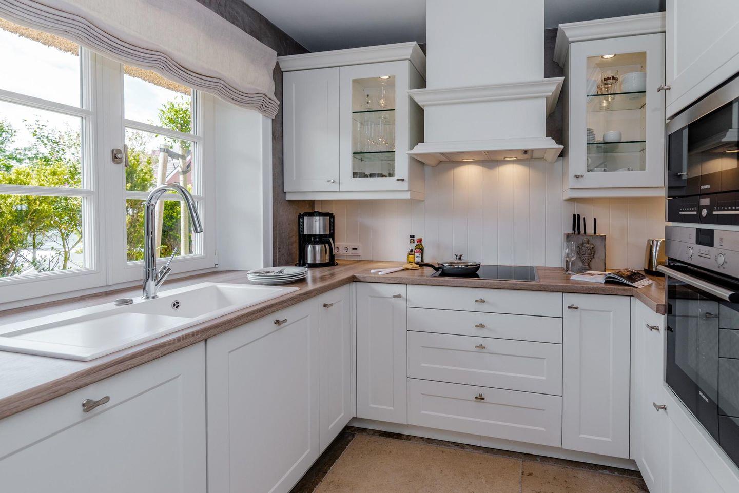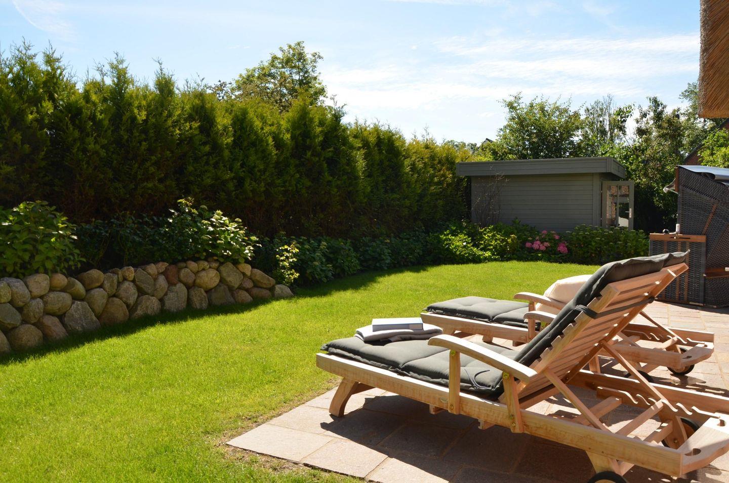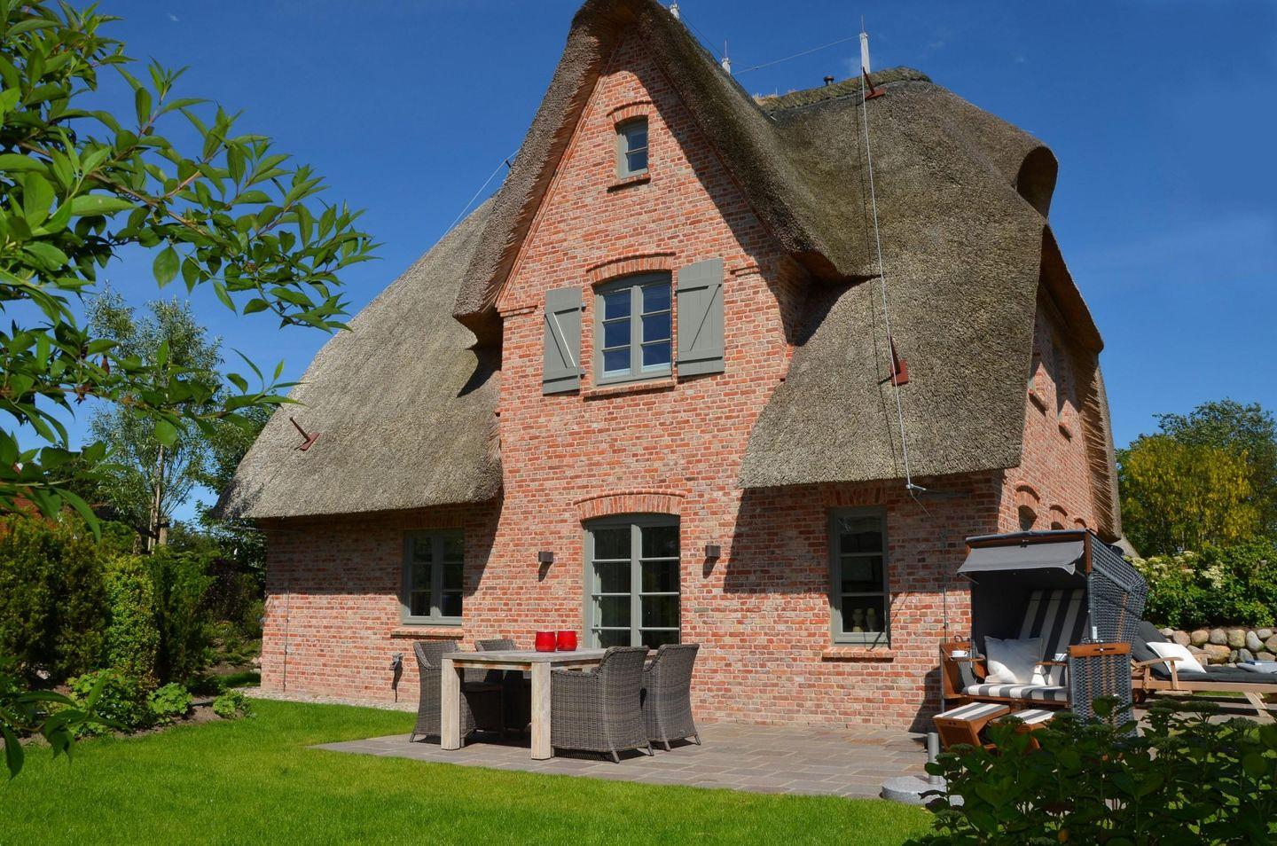Diese traumhafte Doppelhaushälfte unter Reet bietet alles, was einen besonderen Sylt-Urlaub ausmacht. Die hellen Farben und die erlesene Materialauswahl und bezaubernde Antiquitäten im Schweden-Stil verleihen den Räumen ein warmes und behagliches Ambiente. Zahlreiche Tischlereinbauten begeistern in allen Räumen. Vor dem historischen Kachelofen können Sie es sich mit einem spannenden Buch oder einem romantischen Gläschen Wein gemütlich machen. Die gekonnt vom Tischler verbaute moderne BOSE 5.1-Soundanlage verwandelt den Wohnraum bei Bedarf in einen Konzertsaal. Im Obergeschoss erwarten Sie zwei Schlafzimmer und zwei hochwertige Bäder mit Bewegungsmeldern für Schummerlicht, Einbauradios, beheizten Handtuchhaltern und Regenduschen. Die großzügige Sauna schafft eine Wellness-Atmosphäre. Die große Südwest-Terrasse ist bestens geeignet für erholsame Sonnenstunden an der Sylter Luft.