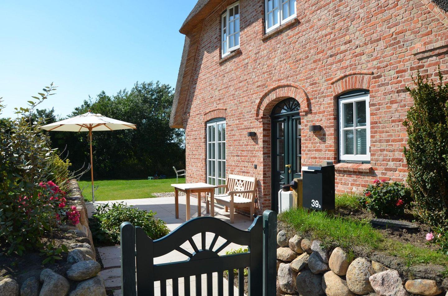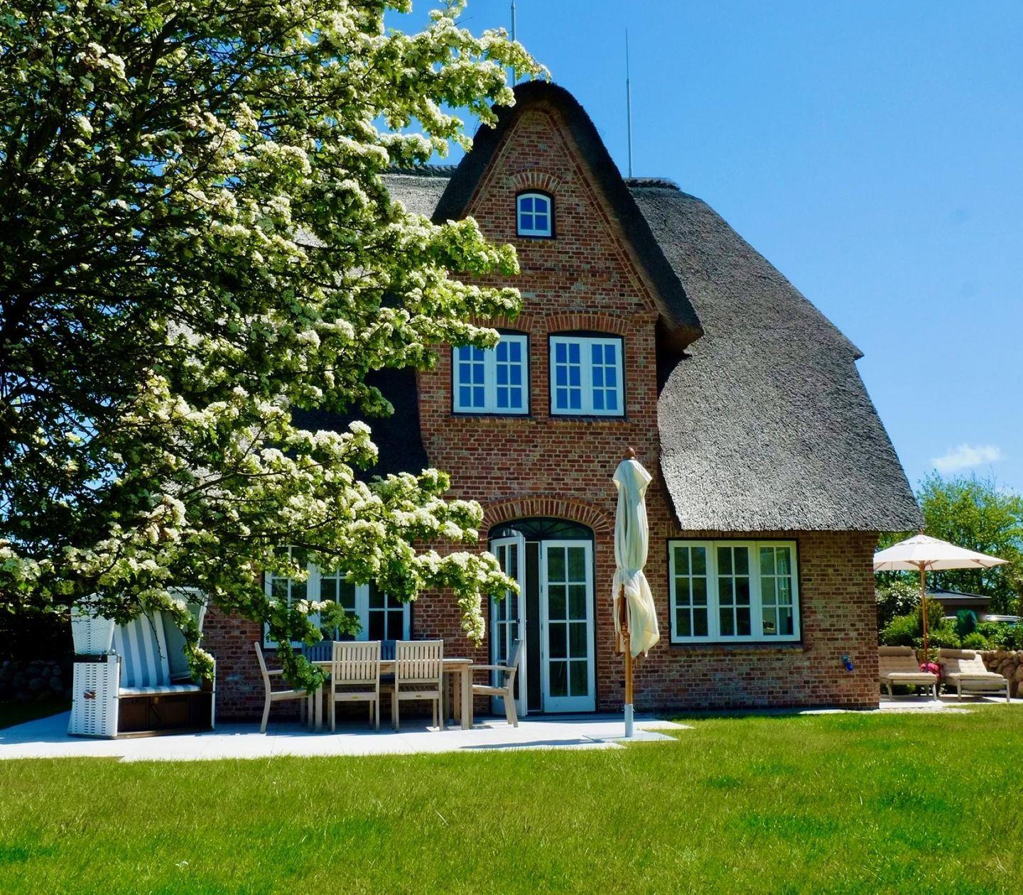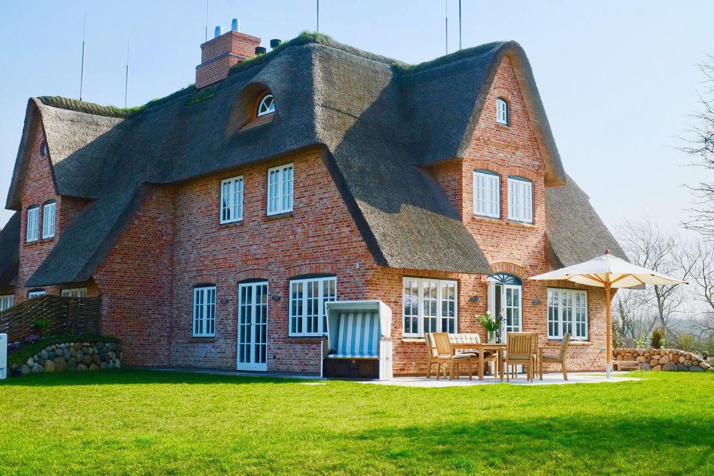 Neubau unter Reet mit freiem Blick aufs Wasser. Großzügig geschnittene Räume, hochwertige Tischlereinbauten und Möbel, ein heller und freundlicher Naturstein aus Frankreich, auf Sylt von Hand nachbearbeitet und antike Fliesen laden zu jeder Jahreszeit zum Entspannen und Träumen ein.