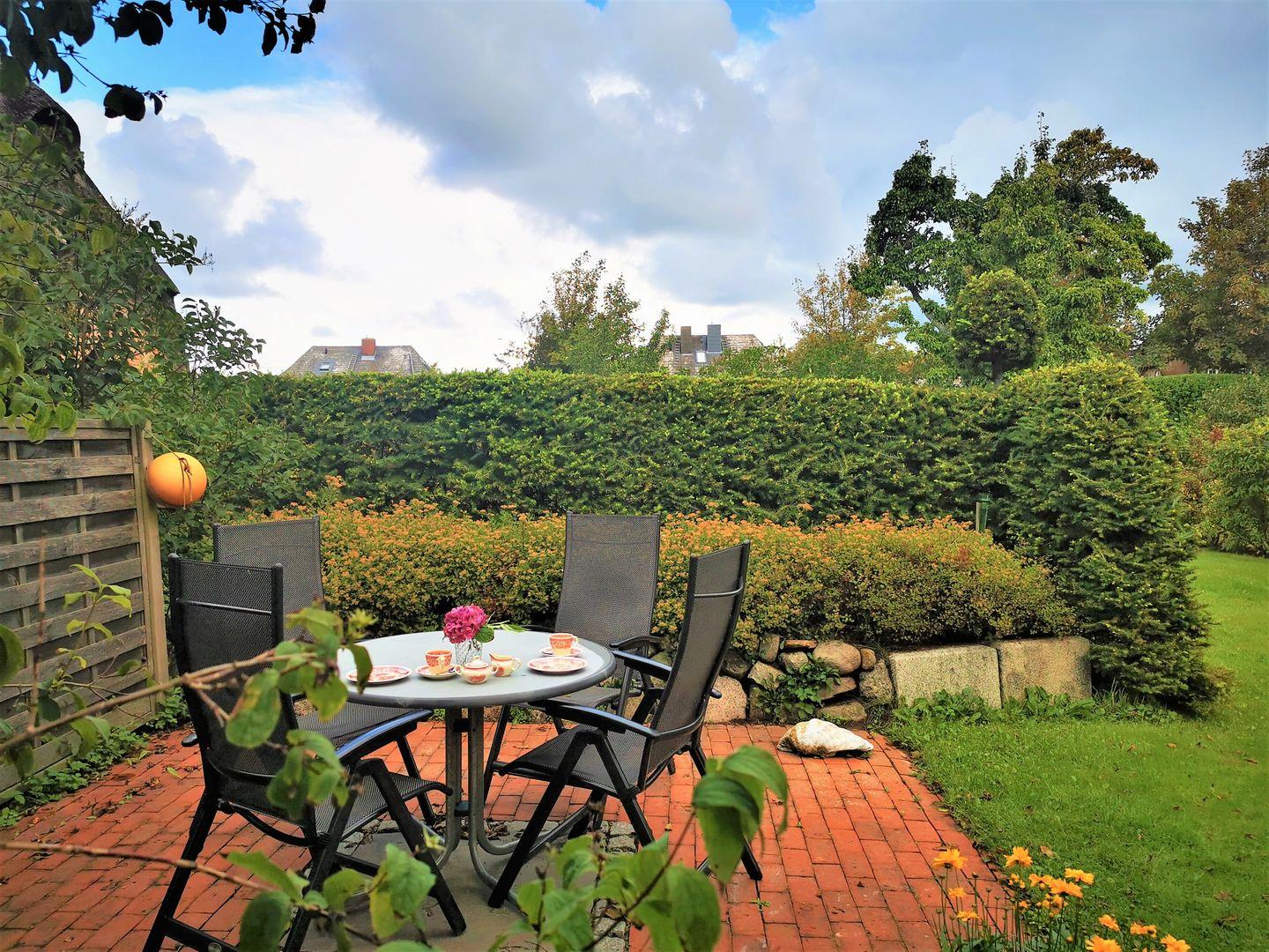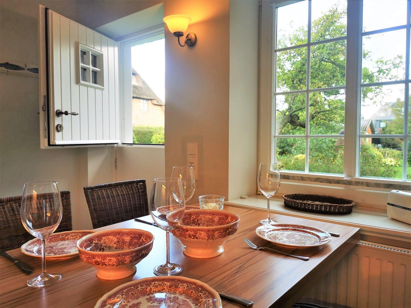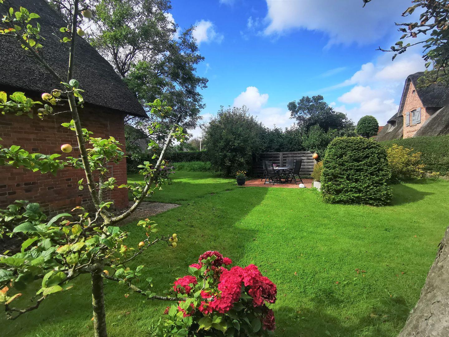 Helle Farben und Akzente aus Antiquitäten sorgen für ein harmonisches Wohngefühl, ohne dass der Charme des Hauses verloren geht. Aus der Küche führt eine Friesentür (Klöntür) hinaus in den Garten mit Terrasse, wo sie die Sylter Luft genießen und sich erholen können. Ein Doppelschlafzimmer und ein Duschbad befinden sich im Erdgeschoss. Vom Lesesessel im Obergeschoss aus, genießen Sie einen tollen Blick über die Morsumer Felder.
