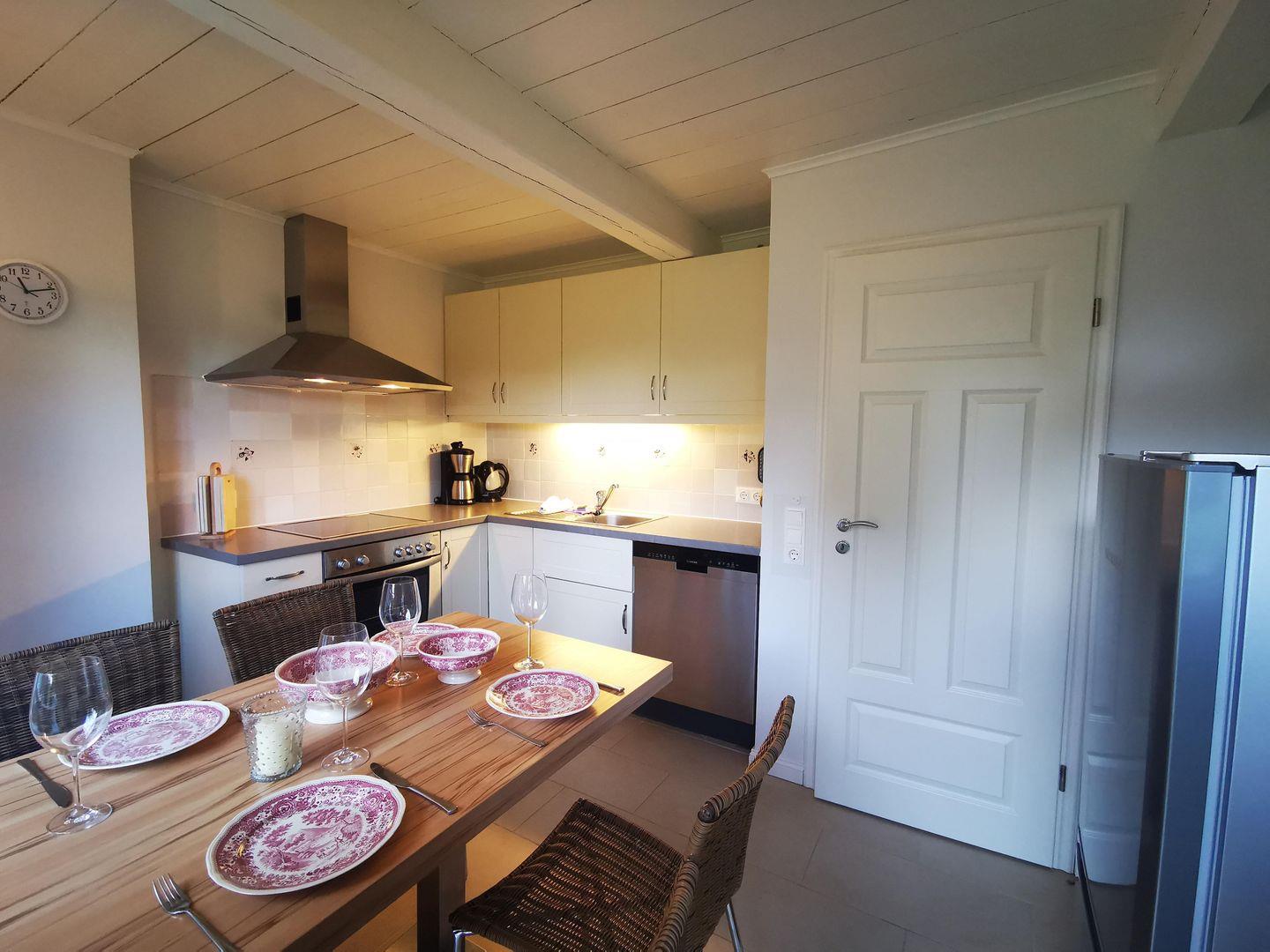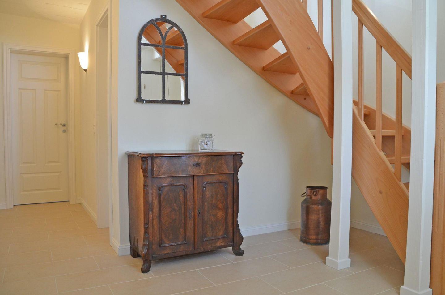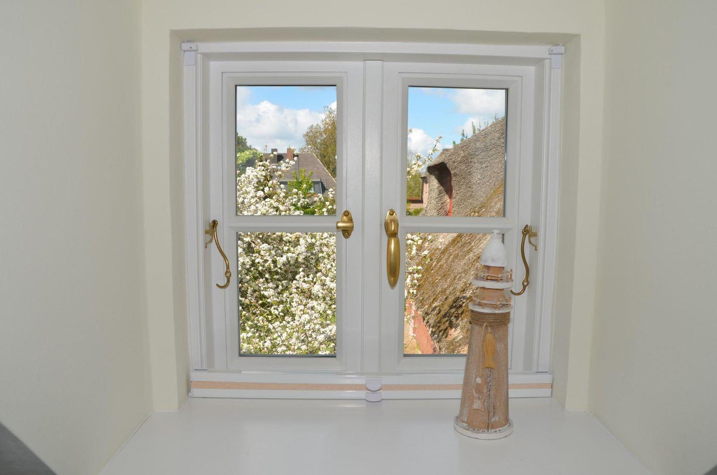 Helle Farben und Akzente aus Antiquitäten sorgen für ein harmonisches Wohngefühl, ohne dass der Charme des Hauses verloren geht. Aus der Küche führt eine Friesentür (Klöntür) hinaus in den Garten mit Terrasse, wo sie die Sylter Luft genießen und sich erholen können. Ein Doppelschlafzimmer und ein Duschbad befinden sich im Erdgeschoss. Vom Lesesessel im Obergeschoss aus, genießen Sie einen tollen Blick über die Morsumer Felder.
