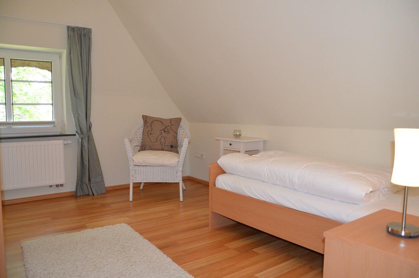 Freundliches Hausteil auf zwei Ebenen in einem historischen Reetdachhaus von 1854! Doppelzimmer und Bad im Erdgeschoss. Zwei Einzelzimmer und Bad im Obergeschoss. Eigene Terrasse und Garten, eigener Parkplatz.