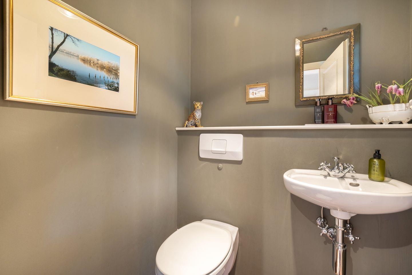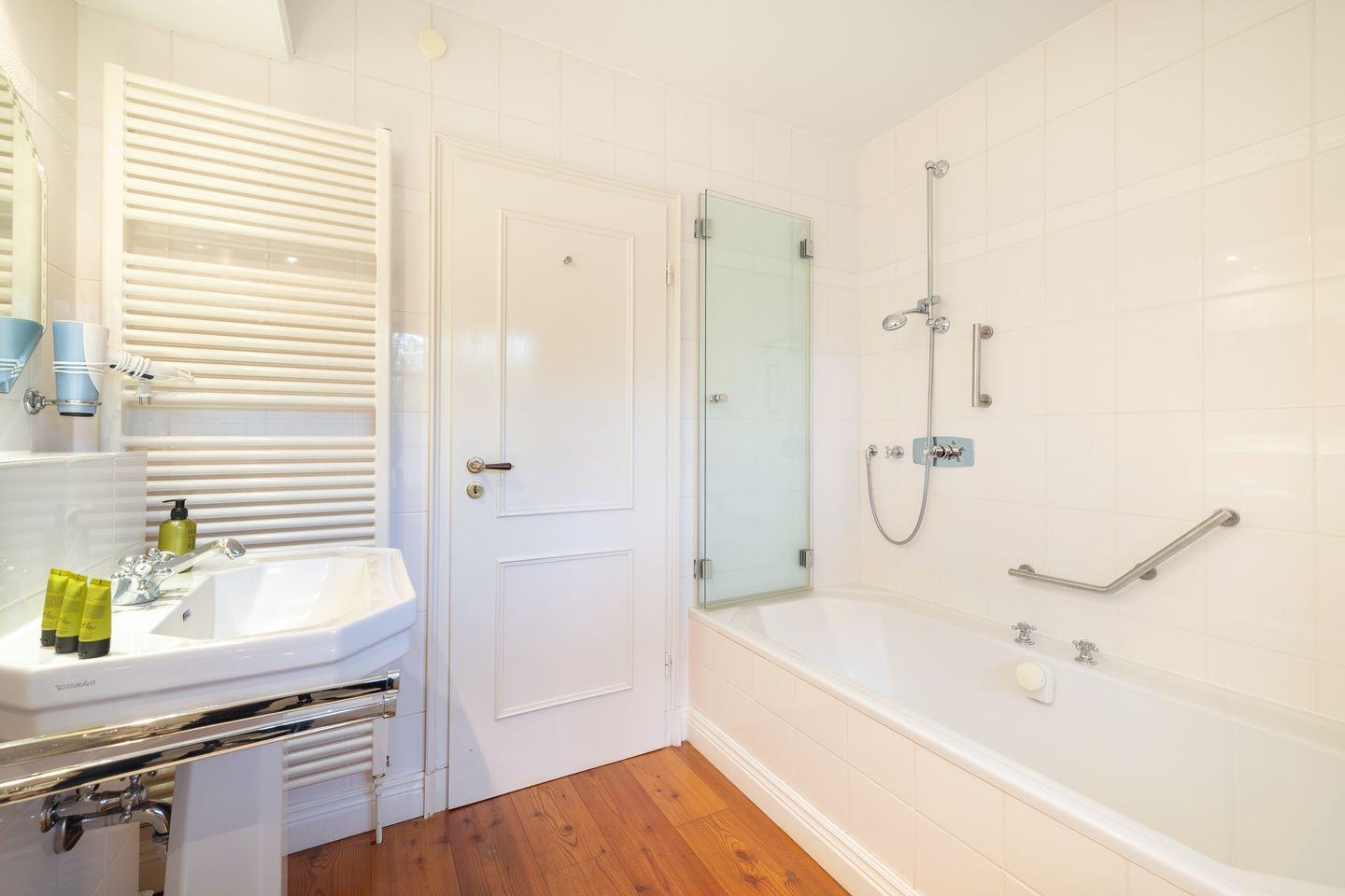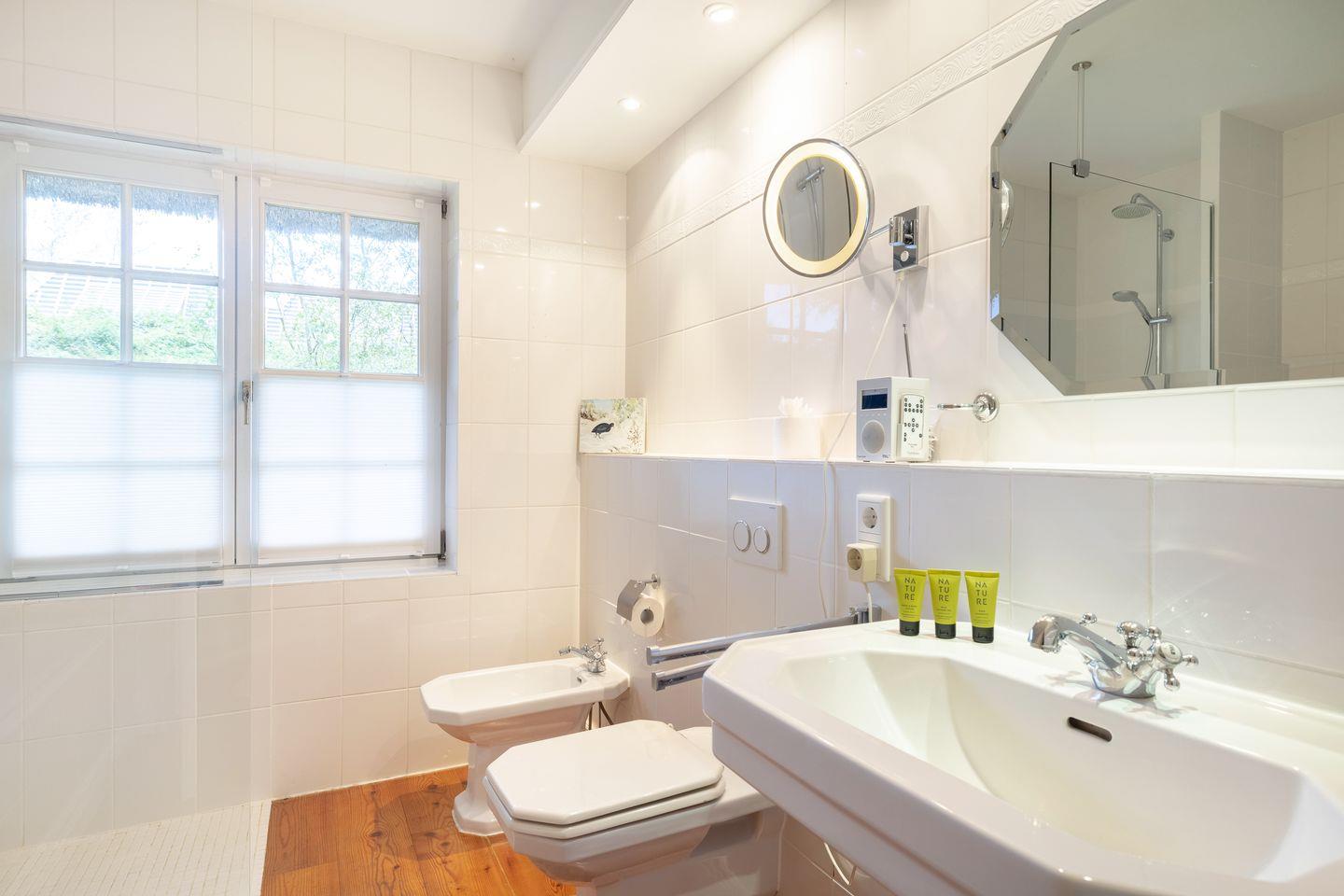 Im Eingangsbereich des einheitlich mit Echtholzdielen ausgelegten Hausteils ist ein separates Gäste-WC mit Fenster vorhanden und in einem von den Wohnräumen und der Küche durch einen Flur mit Sprossenfenstertür abgetrennten Schlaftrakt finden Sie ein großes Bad mit Dielenboden, großem Fenster, Walk In Glasdusche (behindertengerecht), Badewanne, Bidet, WC und vielen Ablageflächen. In allen Räumen finden Sie hochwertige Tischlereinbauten.