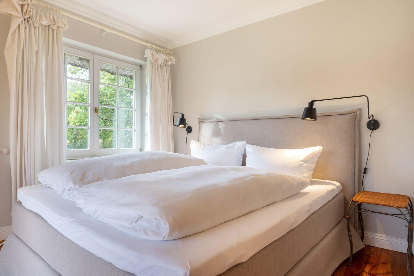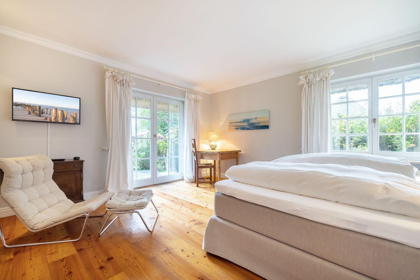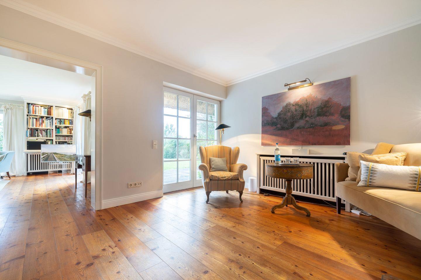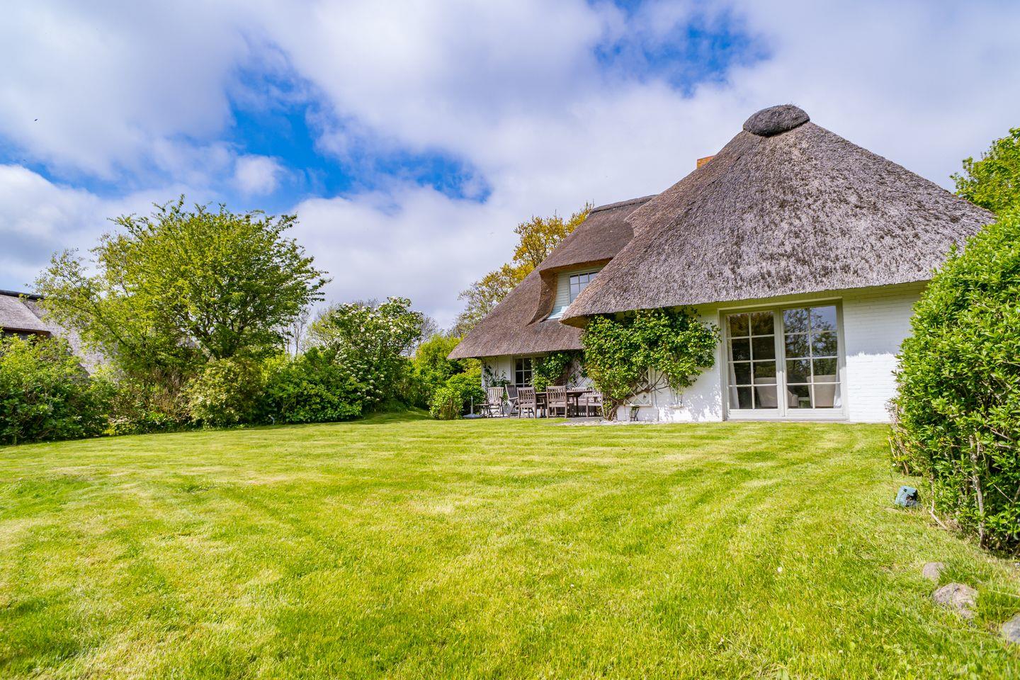 Sie haben durch den raffinierten Grundriss genügend Rückzugsmöglichkeiten, so dass Sie auch in Ruhe ein Buch aus Ihrer eigenen Bibliothek lesen und dabei den Blick aus allen Zimmern in den von bepflanzten Friesenwällen umgebenen Garten des freistehenden Hauses genießen können. Der von der ruhigen Straße aus uneinsehbare Garten mit großem Rasen, mächtigen Hortensien, gepflegten Kletterrosen und altem Baumbestand steht Ihnen allein zur exklusiven Nutzung zur Verfügung. Vier Sonnenliegen sind neben diversem Teakholzmobiliar auf den beiden Terrassen vorhanden.