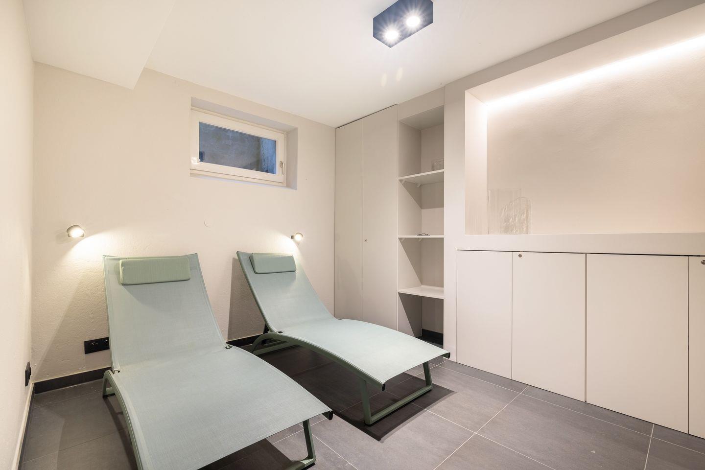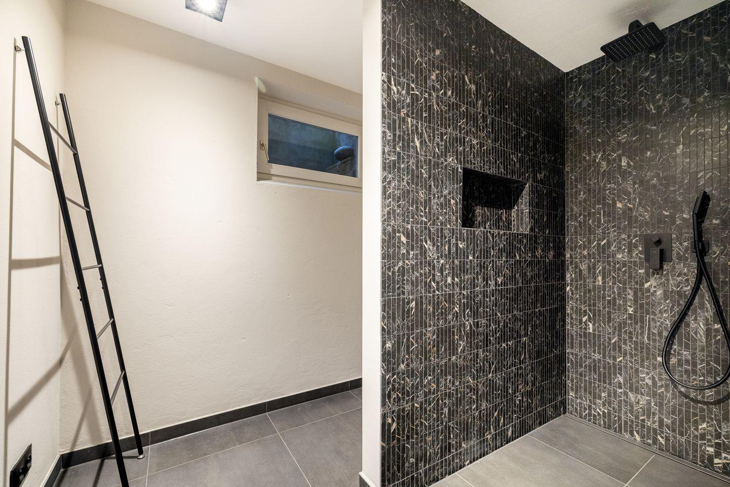 Der Ende 2023 neu geschaffene moderne Wellnessbereich befindet sich in den einzigen genutzten Räumen im modern gestalteten Untergeschoss (auf Sylt oft als „Warftgeschoss“ bezeichnet). Hier finden Sie neben einer grossen Sauna einen mit modernen Tischlereinbauten ausgestatteten Ruheraum mit Fenster sowie eine großzügige bodentiefe Walk In Dusche sowie – separiert – Waschmaschine und Trockner. Im ebenfalls modern gestalteten Treppenhaus können Jacken und Schuhe getrocknet und etwaige Kinderwagen, Hundezugehör etc. (beheizt) untergebracht werden, ohne Sie in der EG Wohnung zu stören.