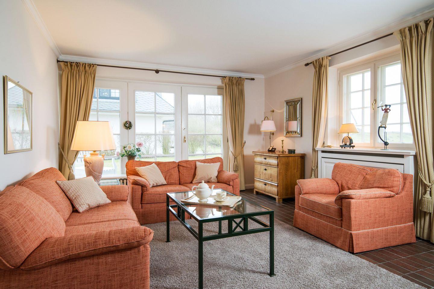 Diese ebenerdige Ferienwohnung ist optimal für 2 Erwachsene und 1 Kind, die ihre Ferien in ruhiger Umgebung verbringen möchten. Sie überzeugt mit ihrer hellen und gemütlichen Einrichtung, der kuscheligen Sitzgruppe und der Terrasse, die vom Wohnzimmer begangen wird. Dort lädt ein Strandkorb zum Entspannen ein (ca. April - Oktober)