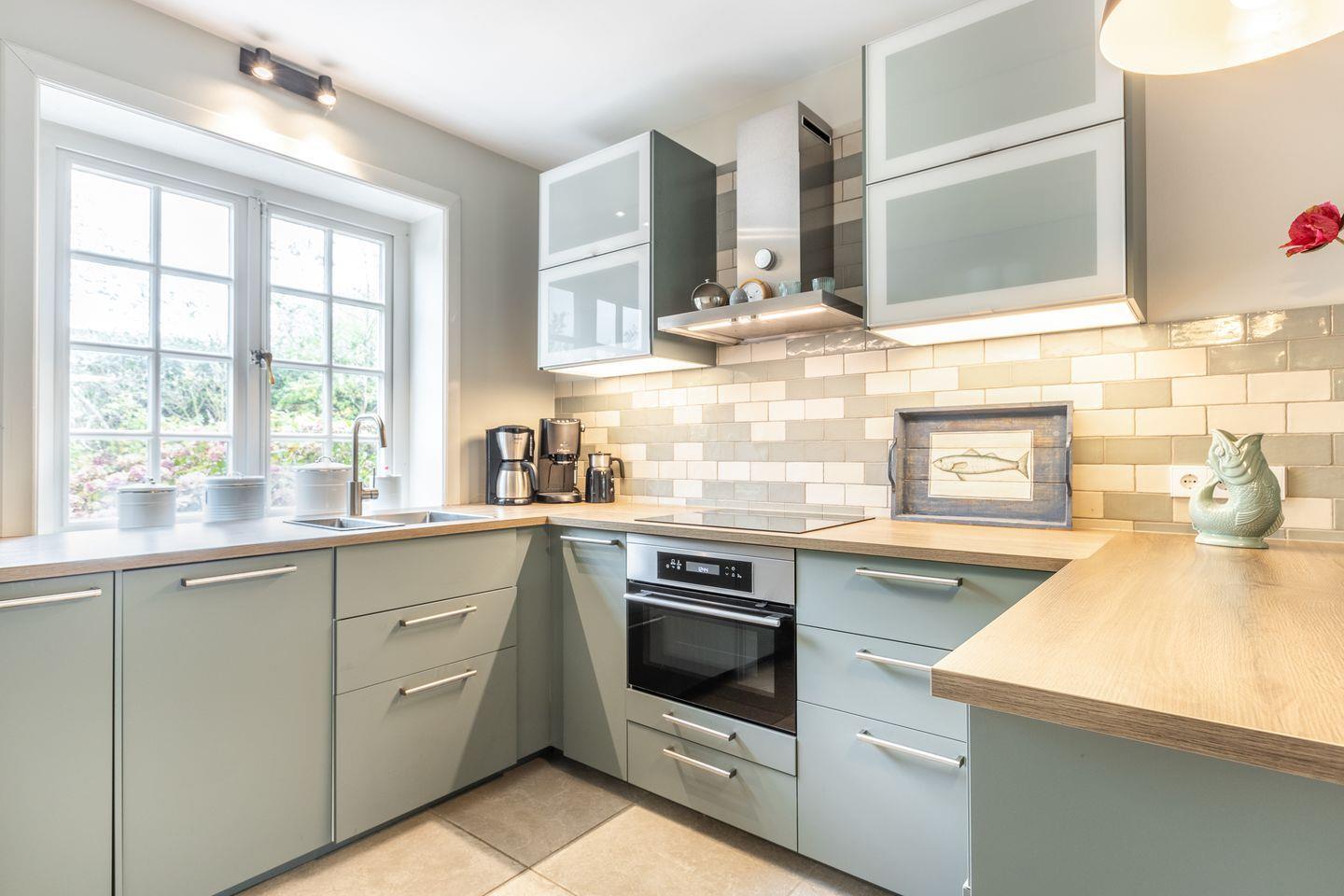 Küche: mit Kühlschrank, Geschirrspüler, Backofen-/Mikro-Kombi, Induktionsherd und beleuchtetem Phrasenabzug. Die Unterbeleuchtung unter den Hängeschränken kann gedimmt werden und geben der Küche ein gemütliches Licht. Das Bedienteil ist an der Esse befestigt.