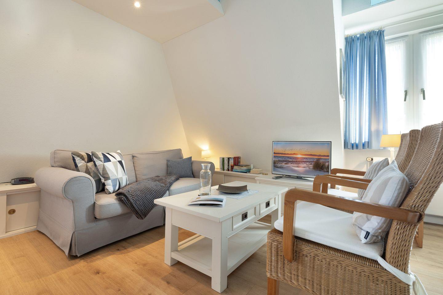 Sonniger Wohnraum mit einer bequemen Sitzgruppe und einem Essplatz am Fenster (TV, WLAN)