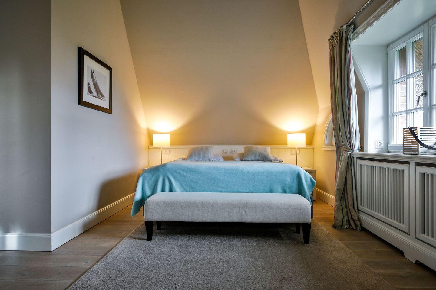 Schlafen 1: geräumiger Schlafraum mit Doppelbett, Einbauschrank, TV, nach oben offenem Giebel
