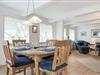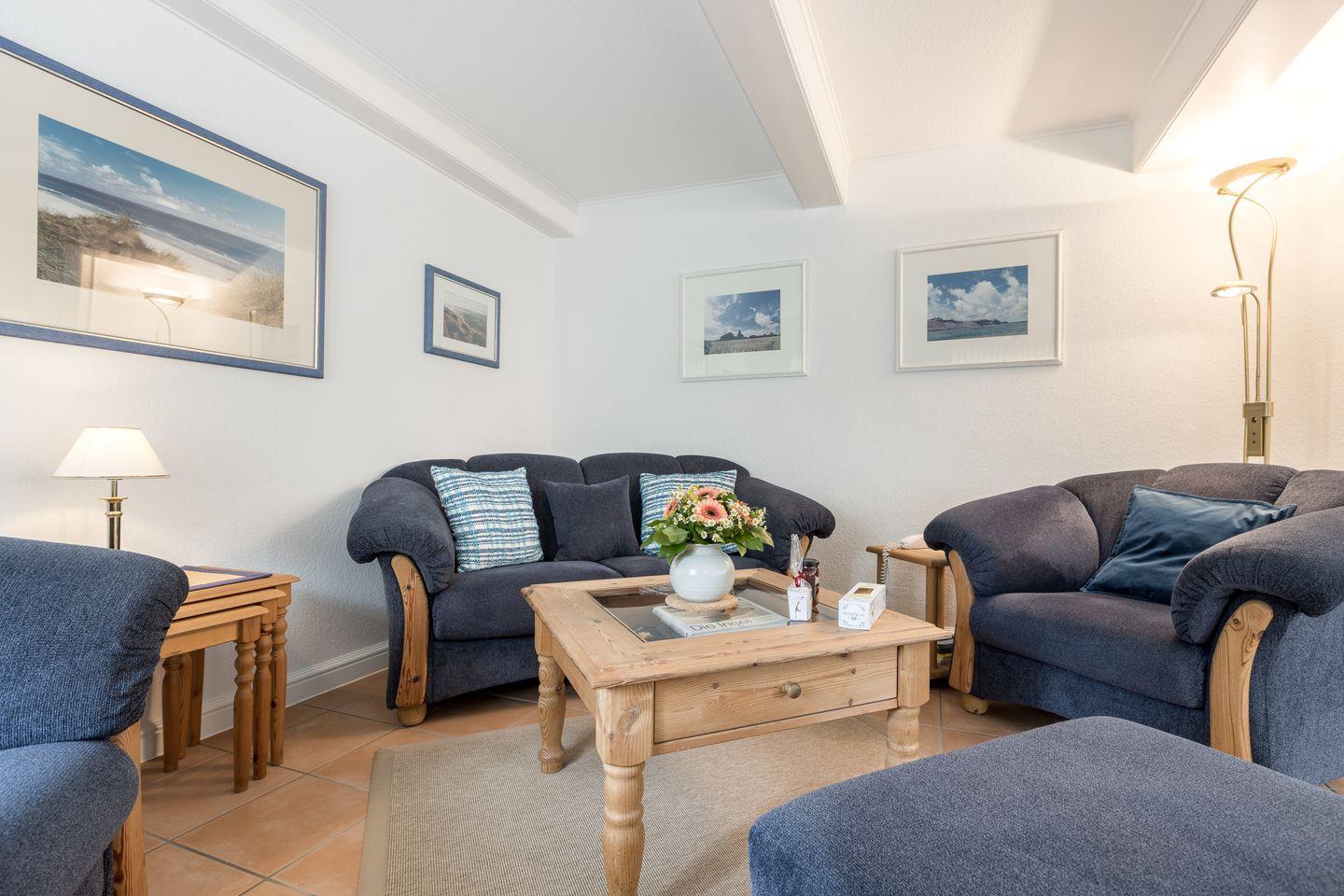 Wohn-/Essbereich: Wohnraum mit gemütlicher Couch, zwei Sesseln und Fußhocker als Sitzecke, Esstisch mit sechs Stühlen