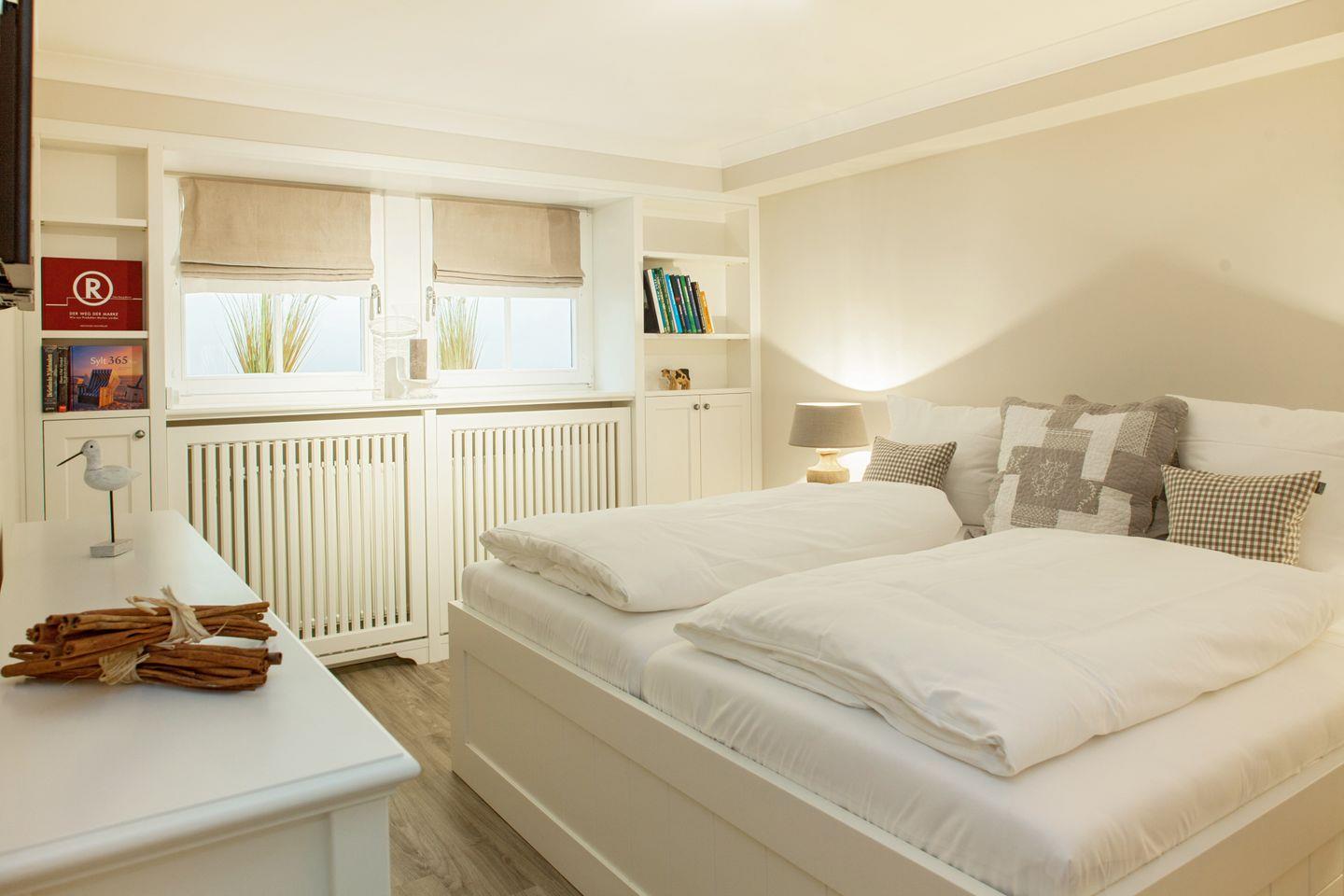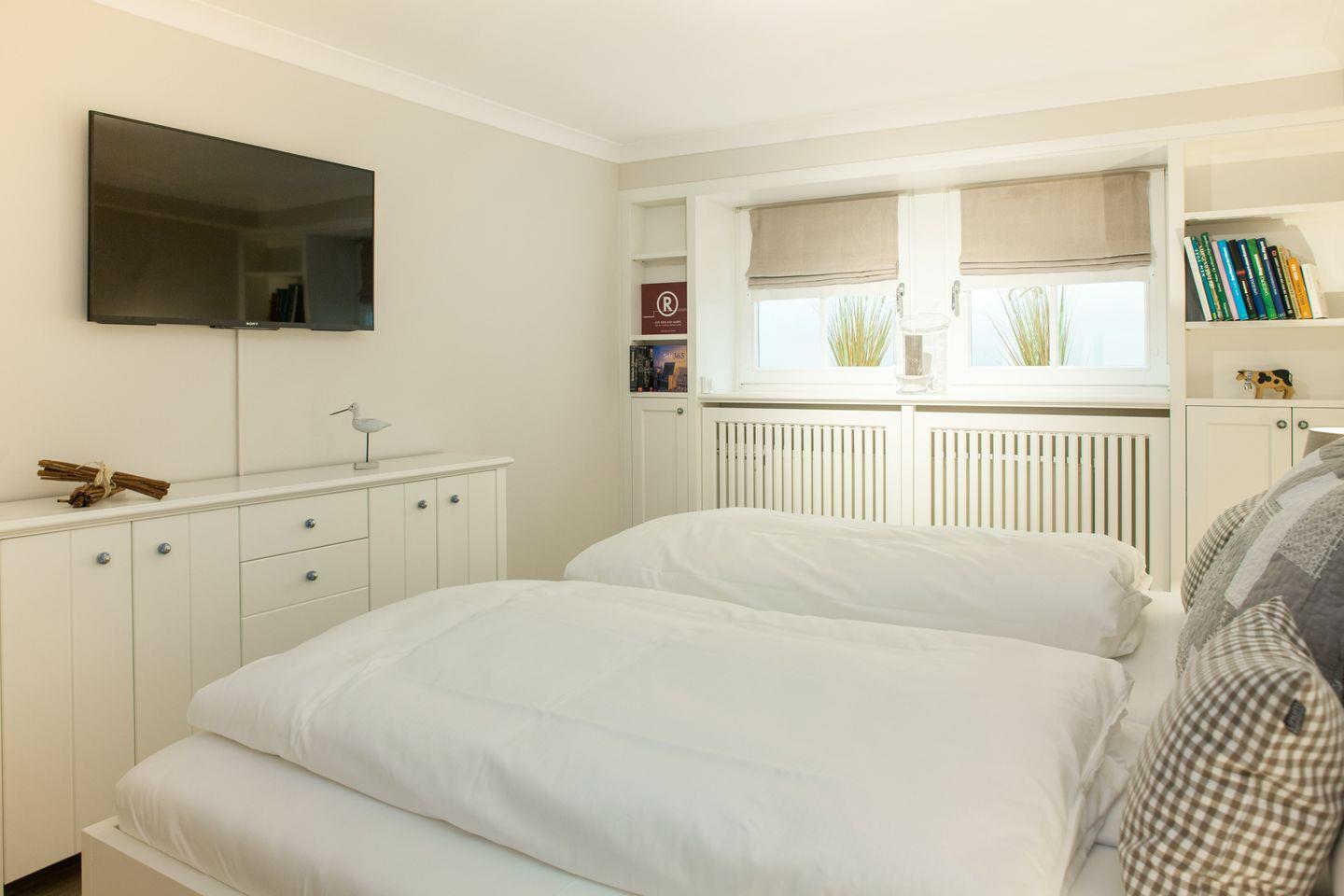 Schlafen 1: großzügiges Schlafzimmer mit Doppelbett (2 Matratzen je 90x200 cm), kleinem Einbauschrank und Flat-TV
