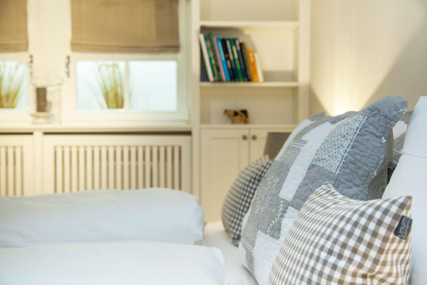 Schlafen 2: Schlafzimmer mit zwei zusammengeschobenen Einzelbetten (2 Matratzen je 90x200 cm) und einem Nachtisch