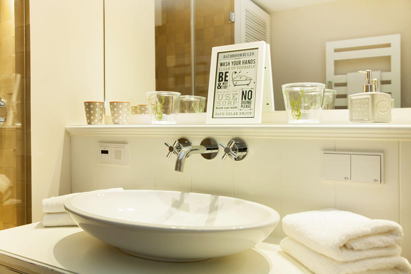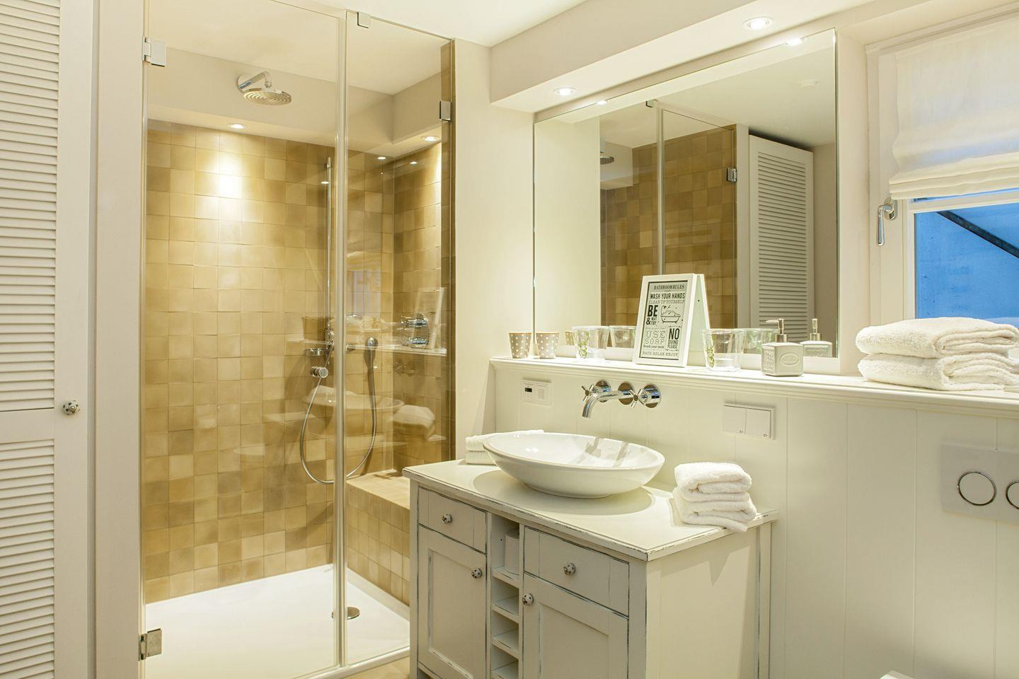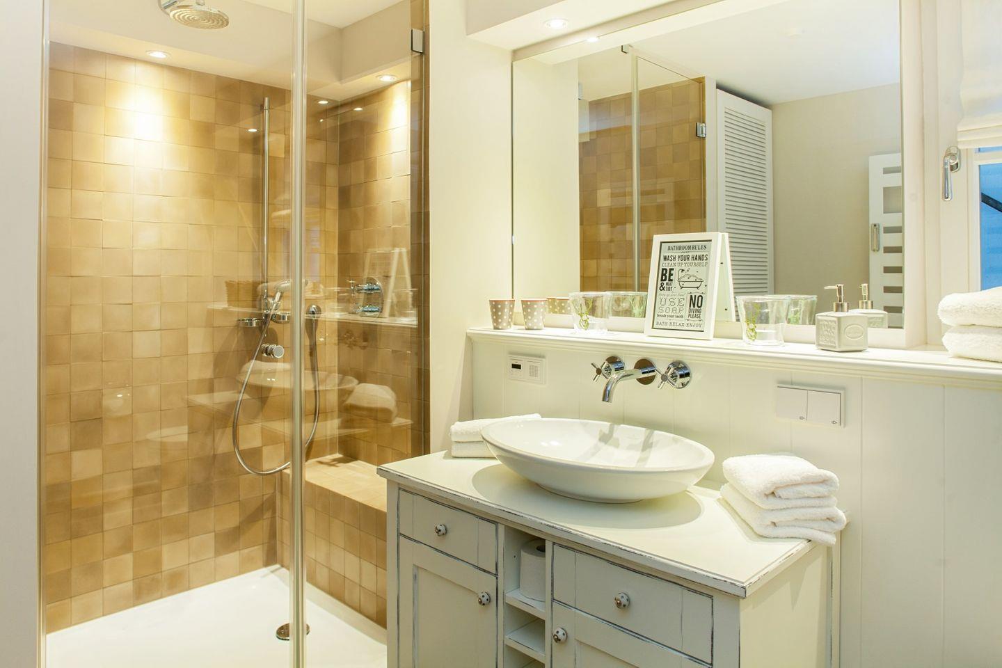 Bad 2: großes Duschbad/ WC mit Einzelwaschtisch, Fußbodenheizung, Handtuchwärmer und Waschtrockner