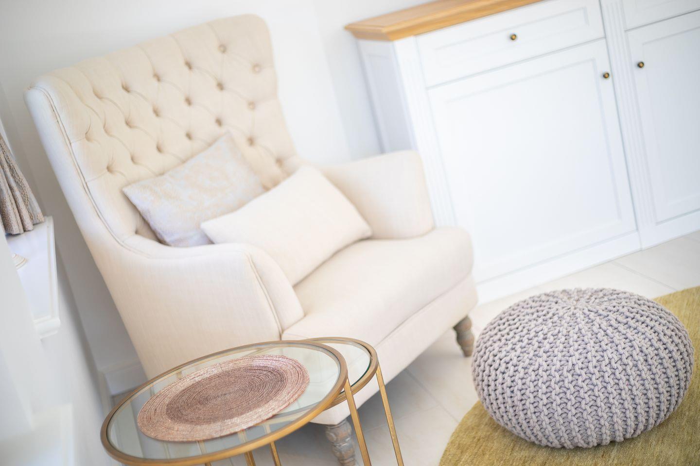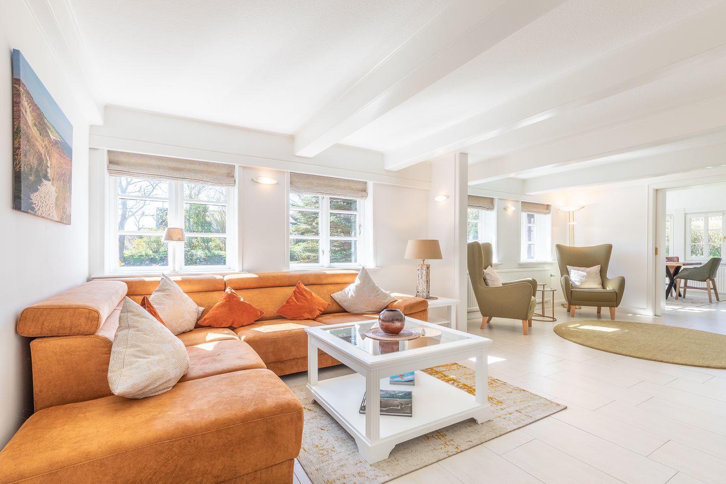 Wohn-/Essbereich: Wohnraum mit hochwertiger Couch, extra Leseecke mit zwei gemütlichen Ohren-Sesseln, angrenzender Essbereich mit langem Holztisch und sechs Ledersesseln mit TV