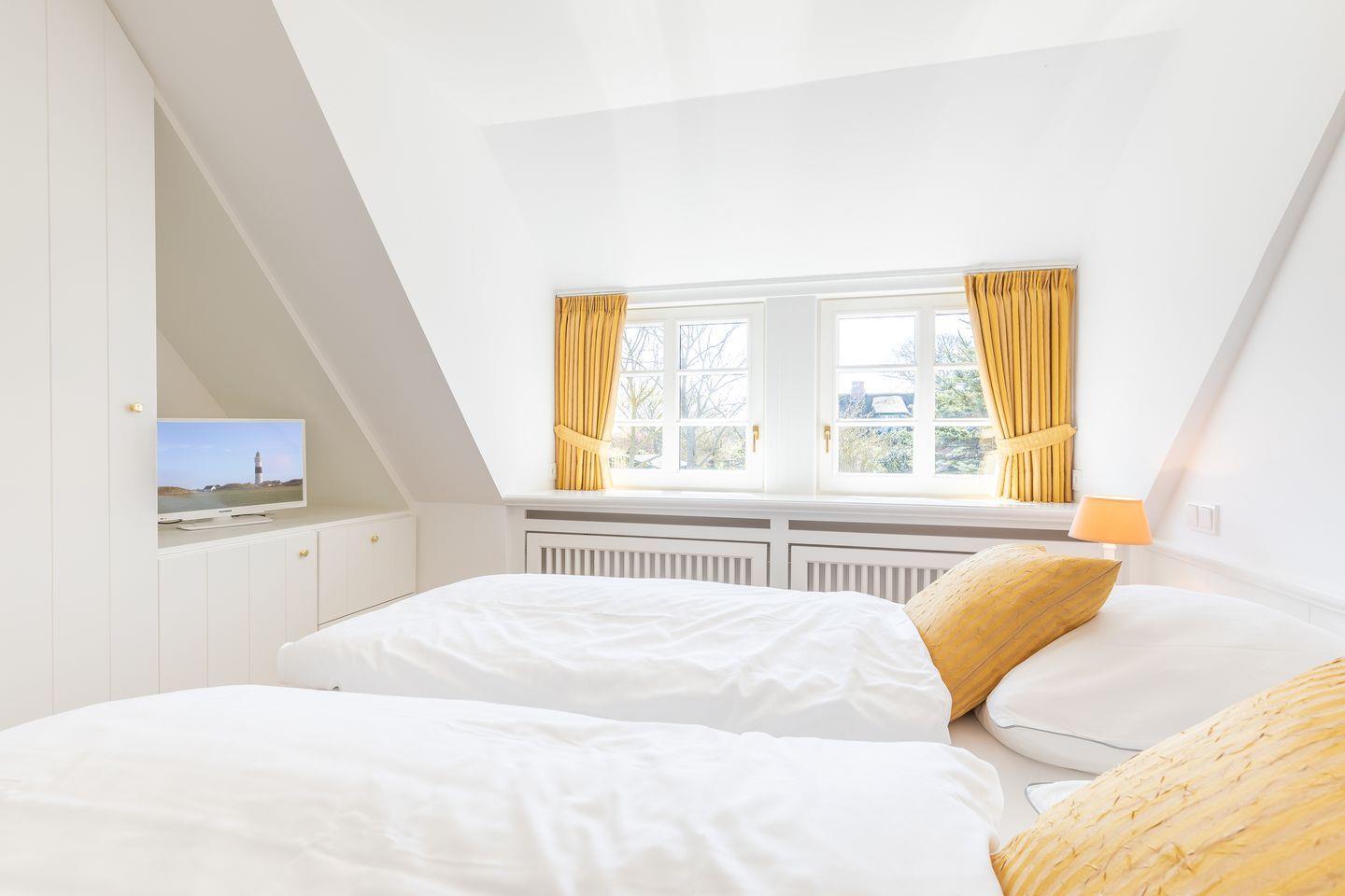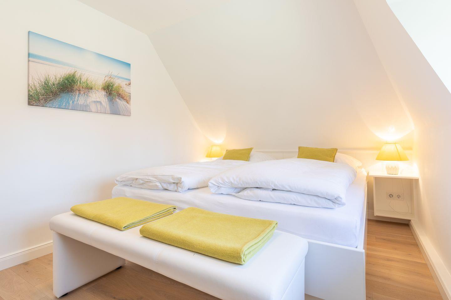 Schlafen 1: Schlafraum mit Doppelbett (2 Matratzen á 90 x 200 cm), Einbauschrank und TV
