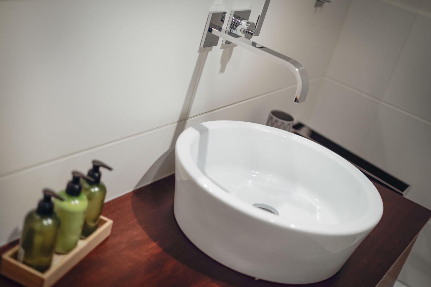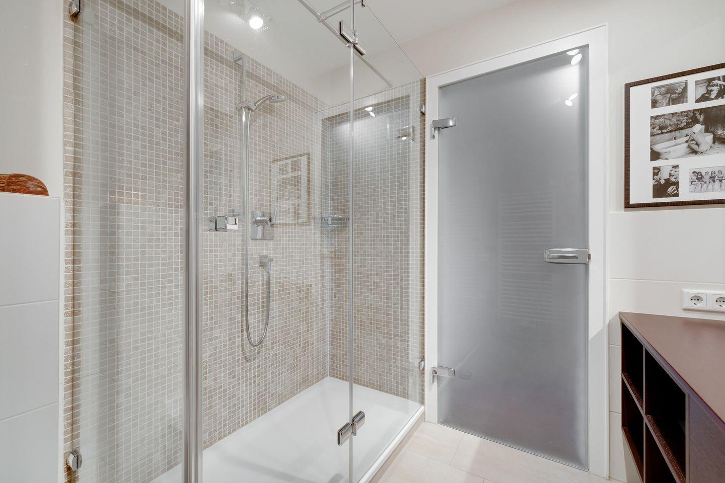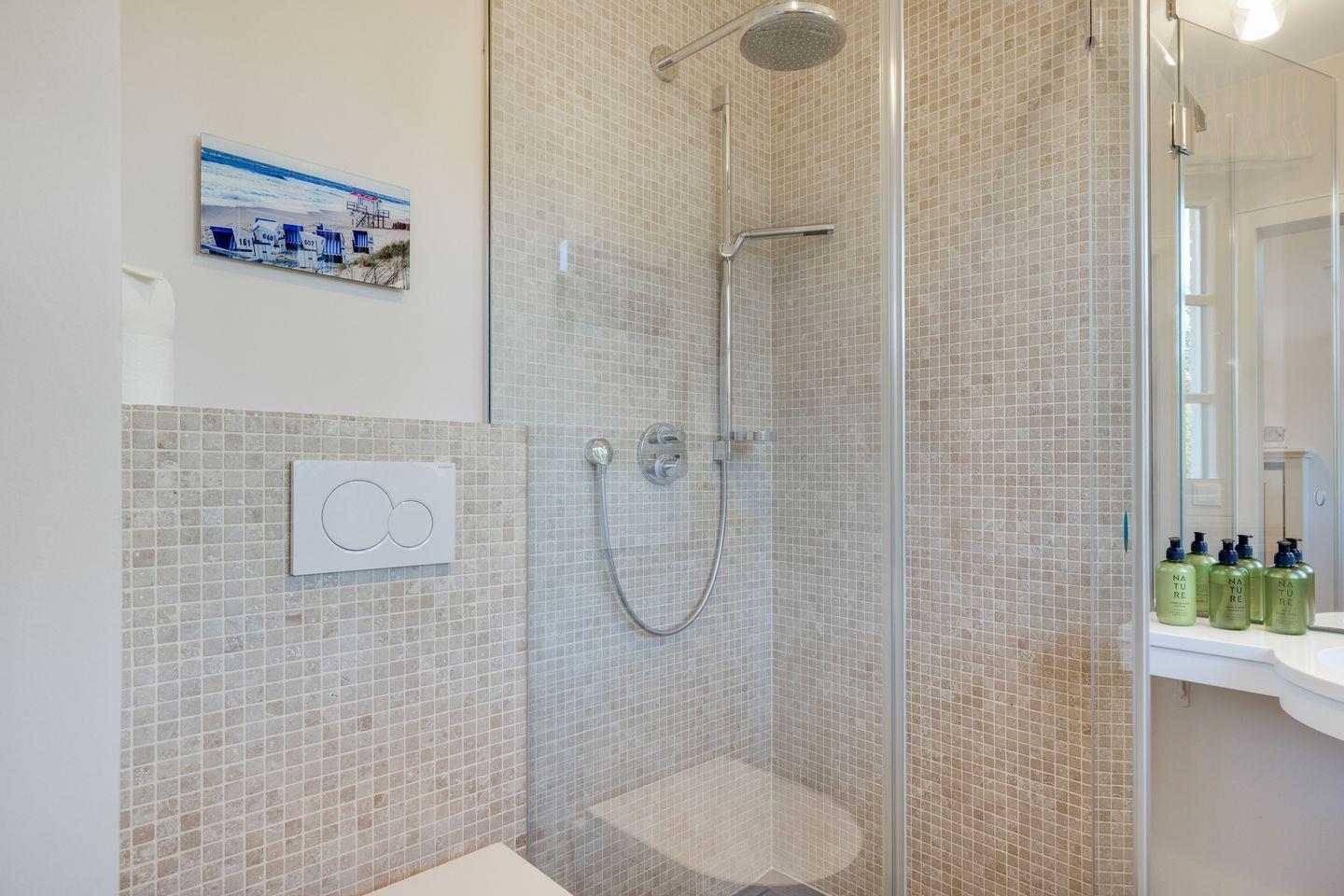 Bad 1: helles, modernes Duschbad (Regendusche) mit Einzelwaschtisch und Spiegel