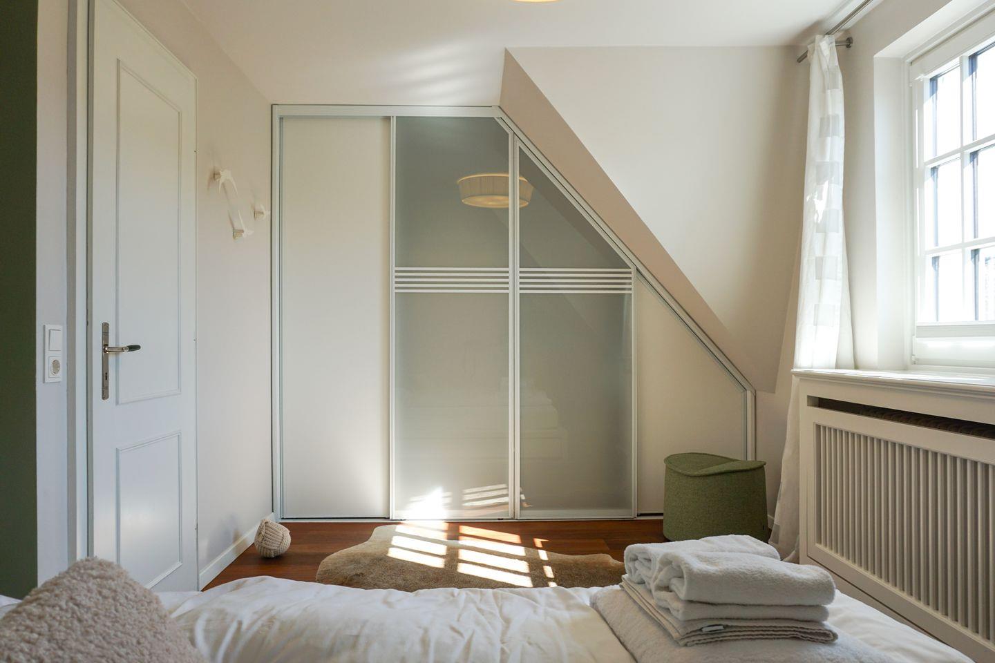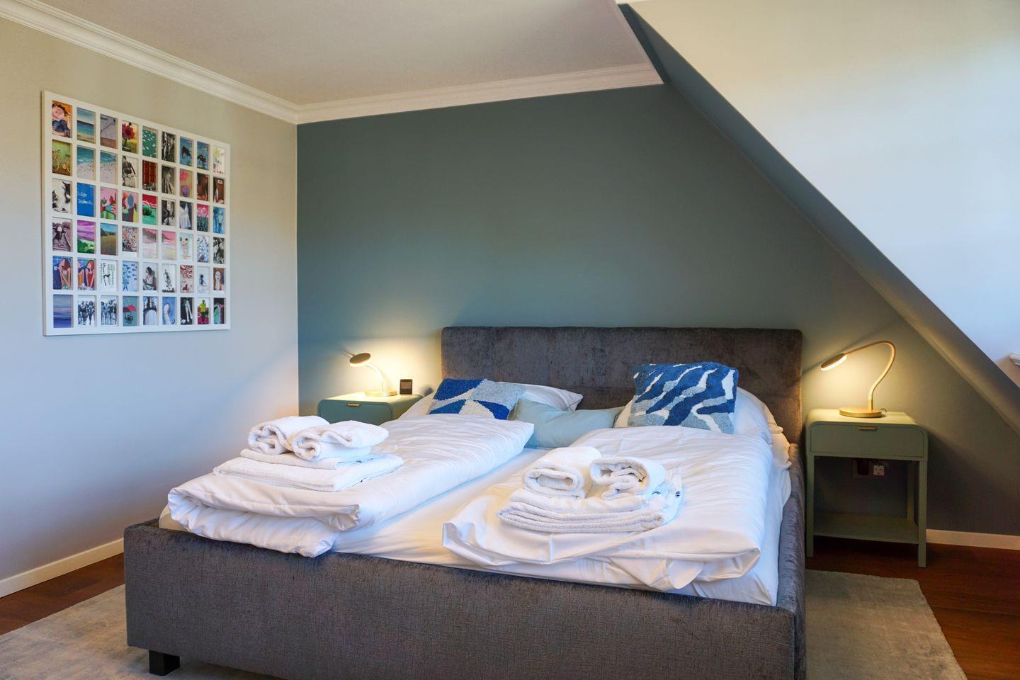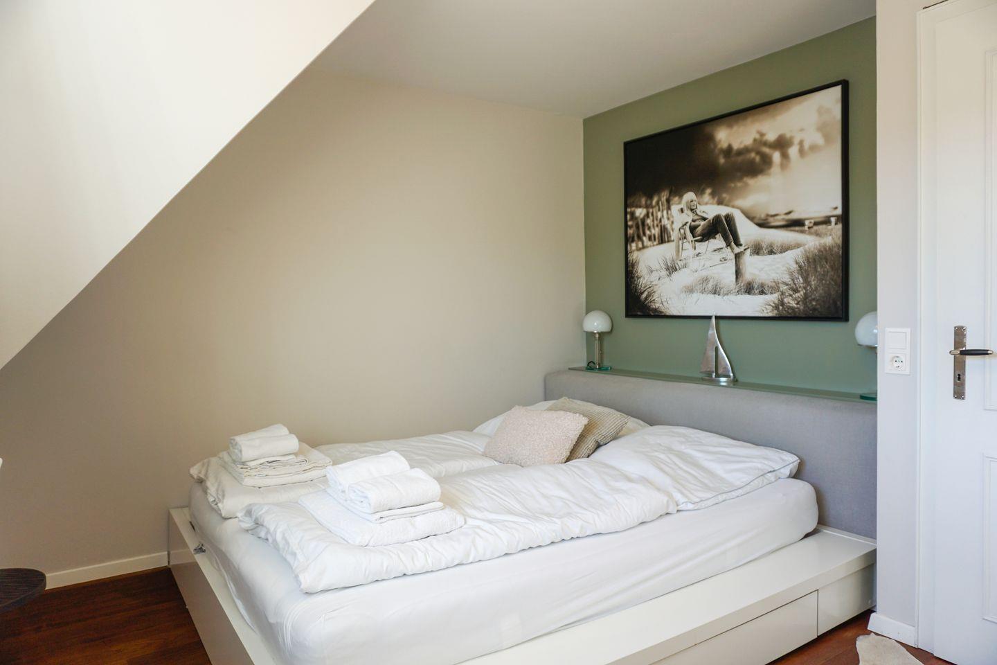 Schlafen 1: geräumiger Schlafraum mit Doppelbett (180 x 200 ohne Fußteil), Hocker, Spiegel und Einbauschrank