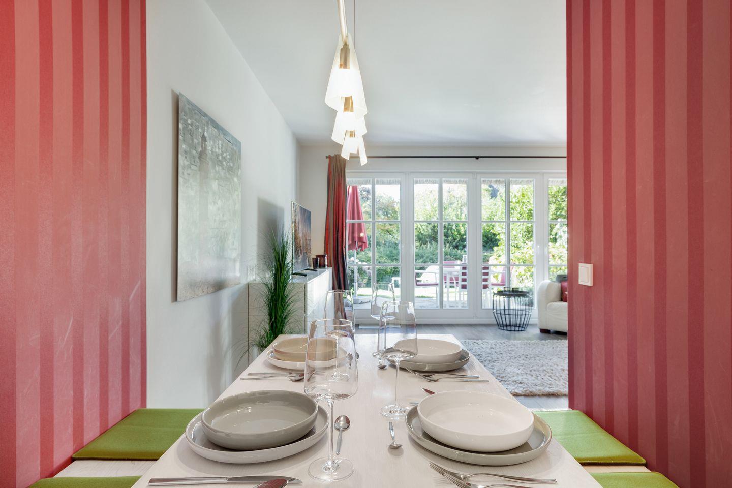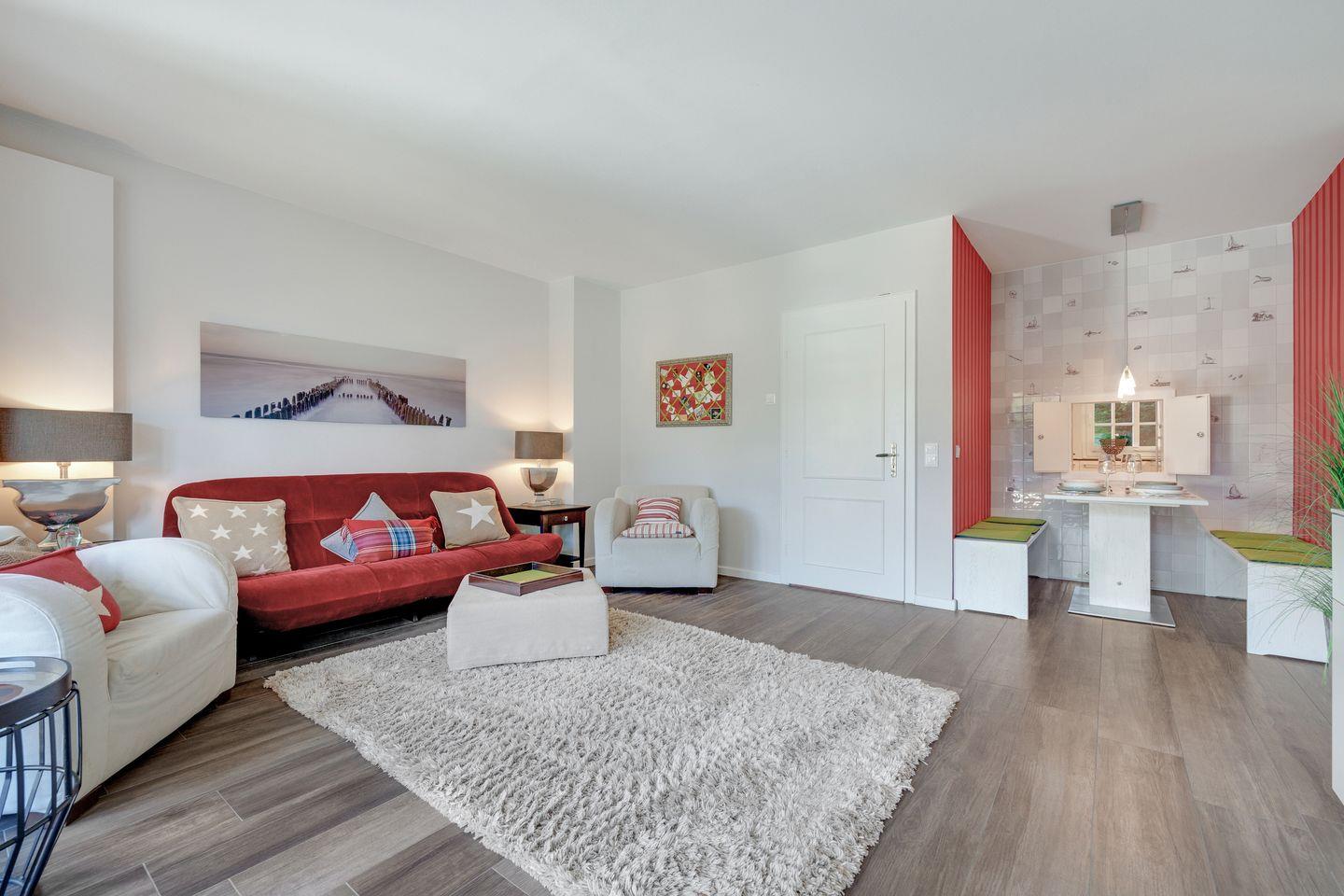 Wohn-/Essbereich: Wohnraum mit roter 3er-Couch, zwei beigefarbenen Sesseln, Flat-TV sowie Musikanlage mit iPod Station; Essecke mit 4 Sitzplätzen und Durchreiche zur Küche