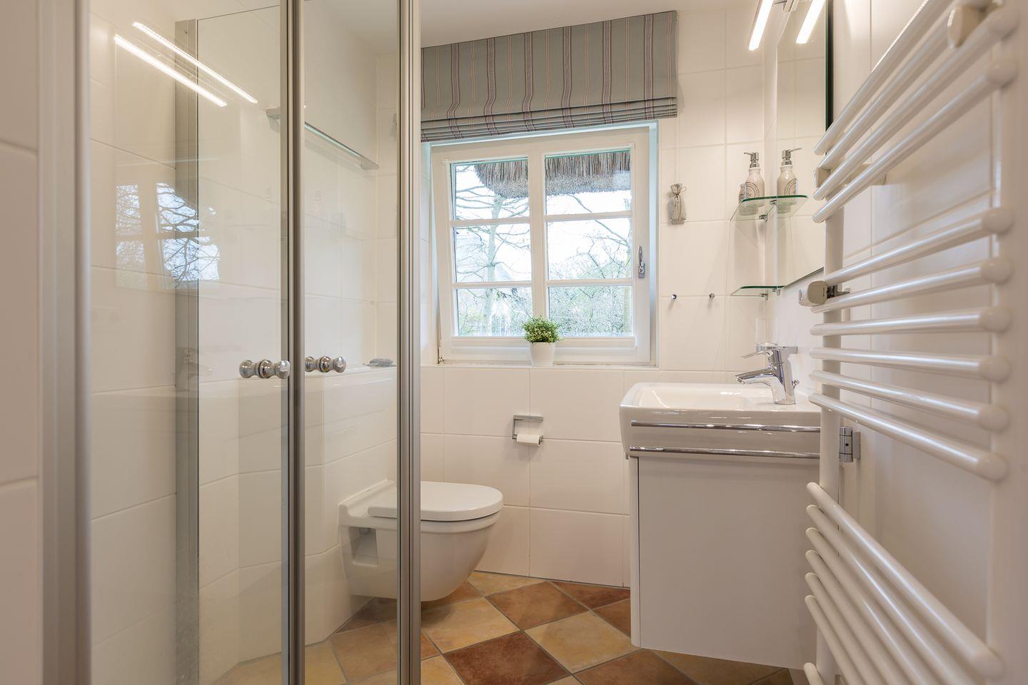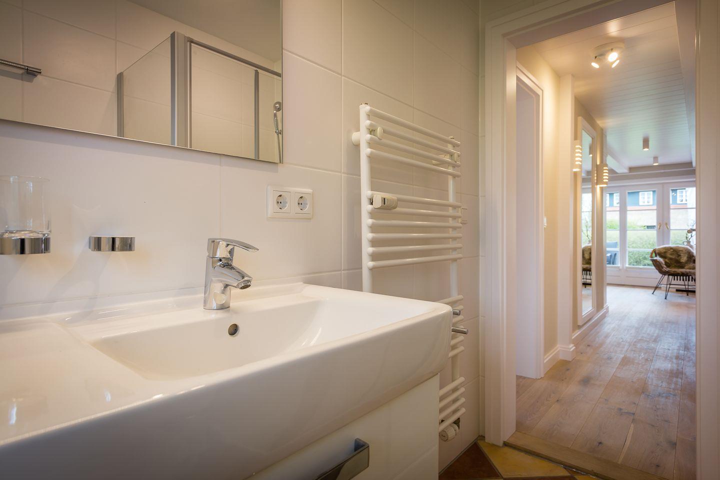 Bad: helles Duschbad mit Einzelwaschtisch und großem Spiegel.
