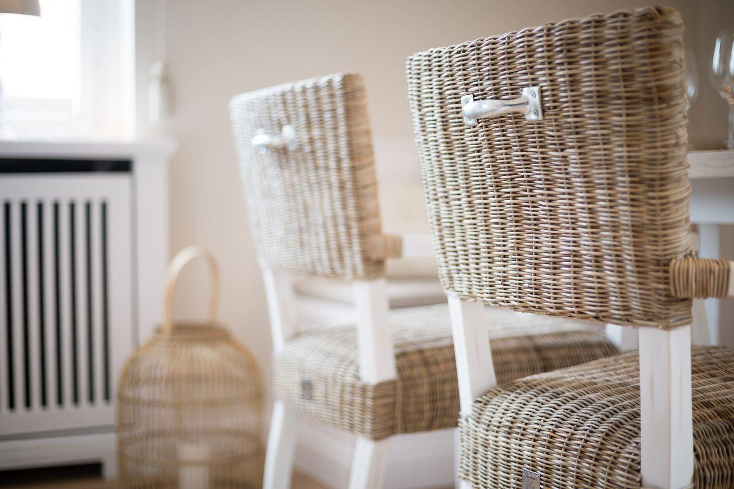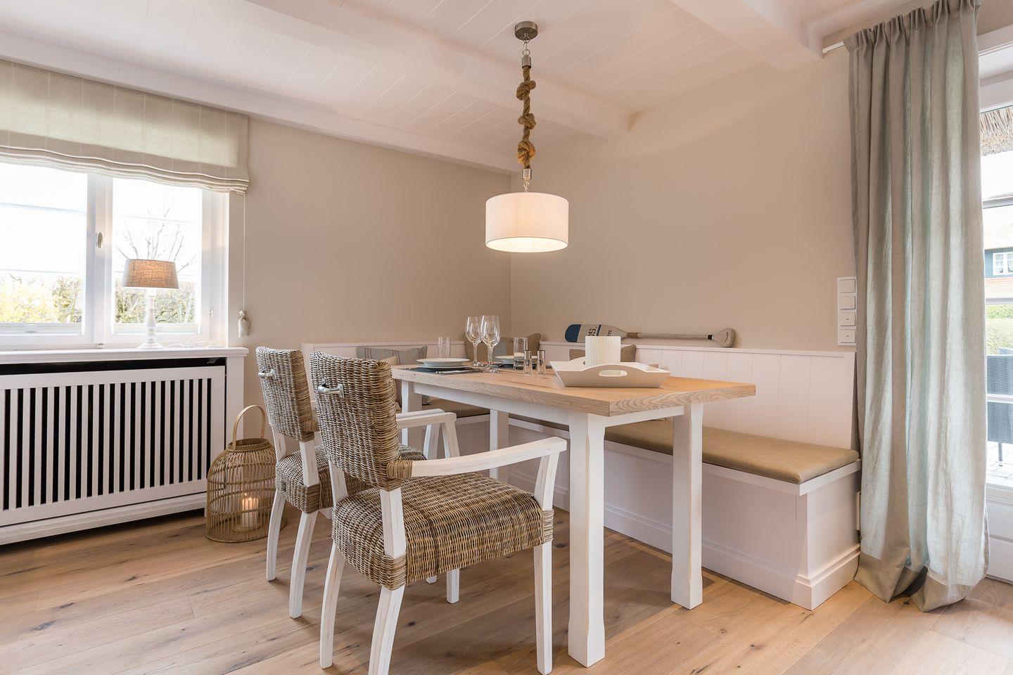 Wohn-/Essbereich: Wohnraum mit gemütlicher Eckcouch und Rattansessel; großzügiger Essbereich mit Eckbank, Tisch und zwei Rattanstühlen