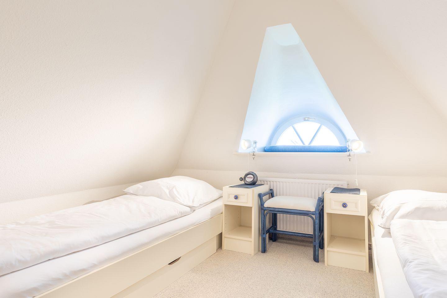 Schlafen 2: gemütliches Studio mit zwei Einzelbetten (90 x 200 cm, ohne Fußteil), kleiner Tisch mit 2 Stühlen und Einbauschrank, das Studio ist mit einer Schiebetür vom Flur getrennt.
