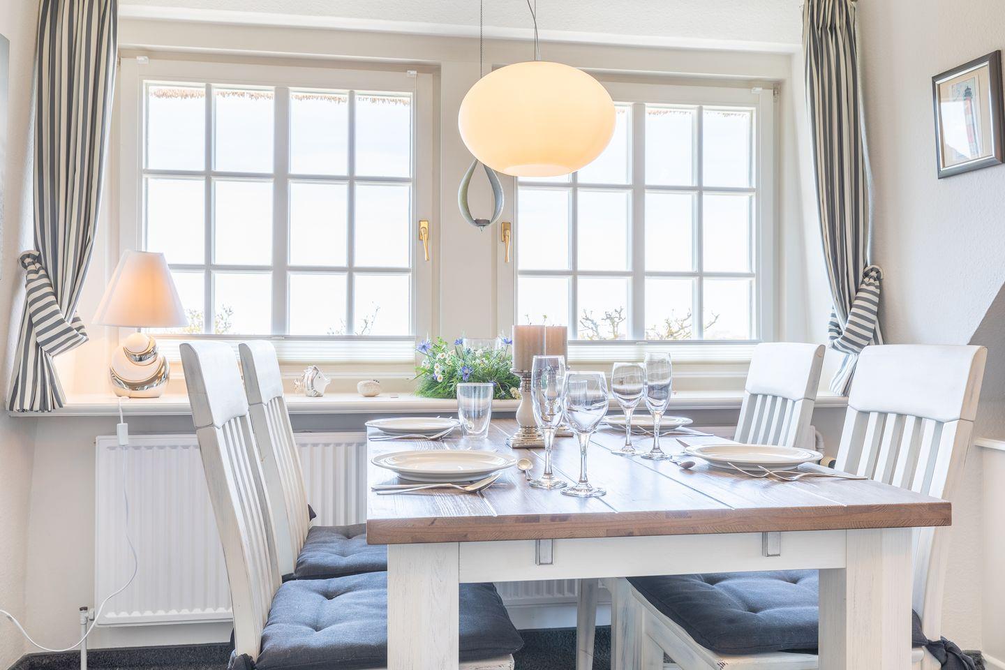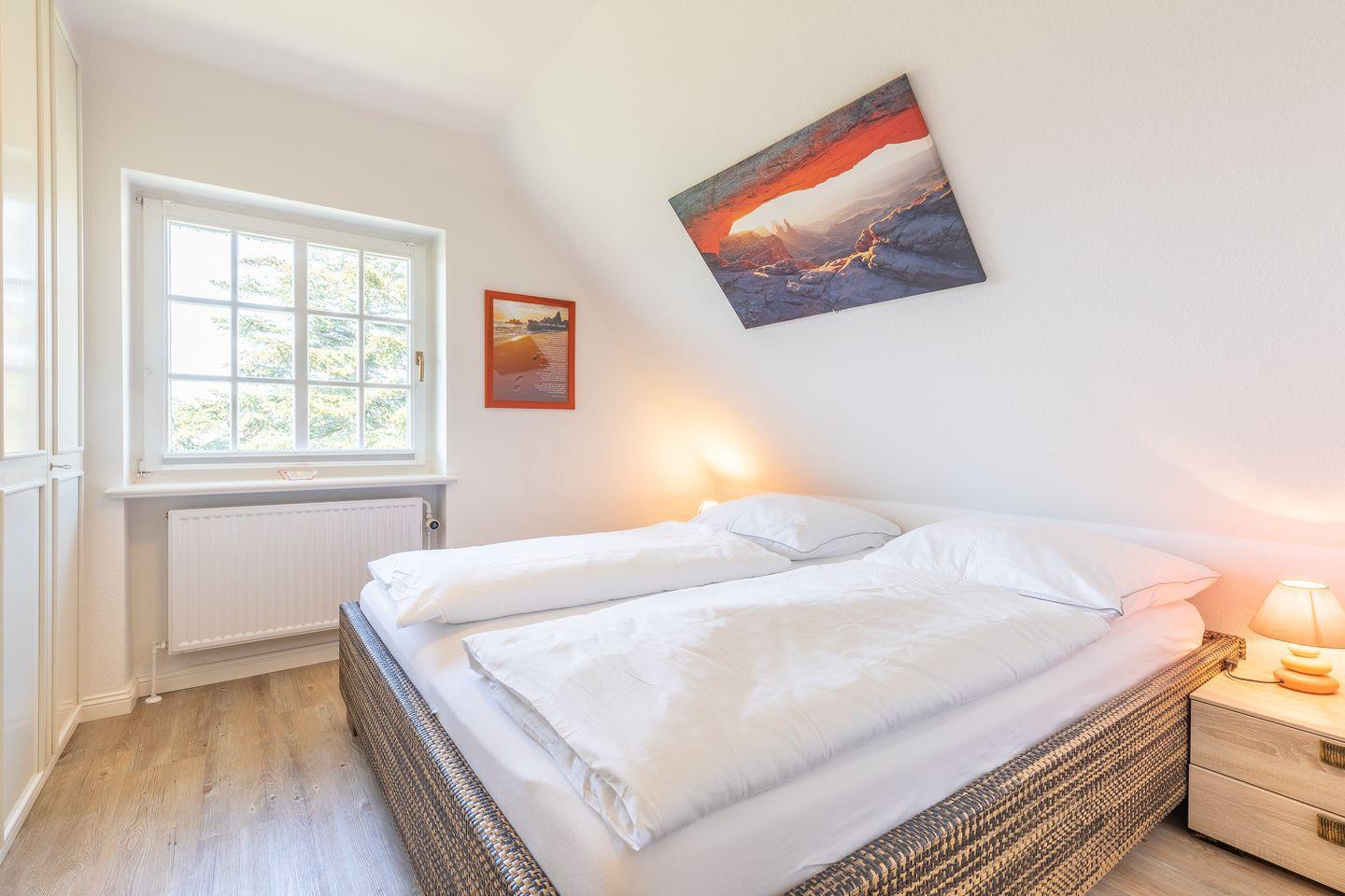 Die hier vorgestellte Ferienwohnung im Obergeschoß und ausgebautem Dachgeschoß in Nordwestlage ist ca. 65 m² groß und bietet zwei bis vier Personen Platz. Das reetgedeckte Haus liegt ca. fünf Gehminuten vom Wattenmeer entfernt. Die Einrichtung ist sehr gepflegt und gemütlich. Die Wohnung verfügt über Komfort wie zwei Flat-TV, DVD, Stereoanlage mit CD, Telefon, WLAN, Geschirrspüler, Kaffeepadmaschine "Dolce-Gusto", Mikrowelle mit integrierter Dunstabzugshaube, Backofen und Waschtrockner. Zur Wohnung gehört keine Gartennutzung.
