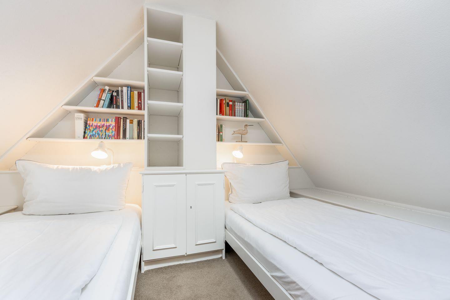 Schlafen 2: zusätzlicher Bereich im Spitzboden mit Teppichboden (durch eine offene Treppe zu erreichen, ohne separate Tür) mit kleinem Tisch und Stuhl, kleiner Sofanische sowie eingebautem Schlafbereich (mit Tür) für Kinder mit zwei Einbaubetten (je 90 x 190 cm) und weißen Einbau-Regalen