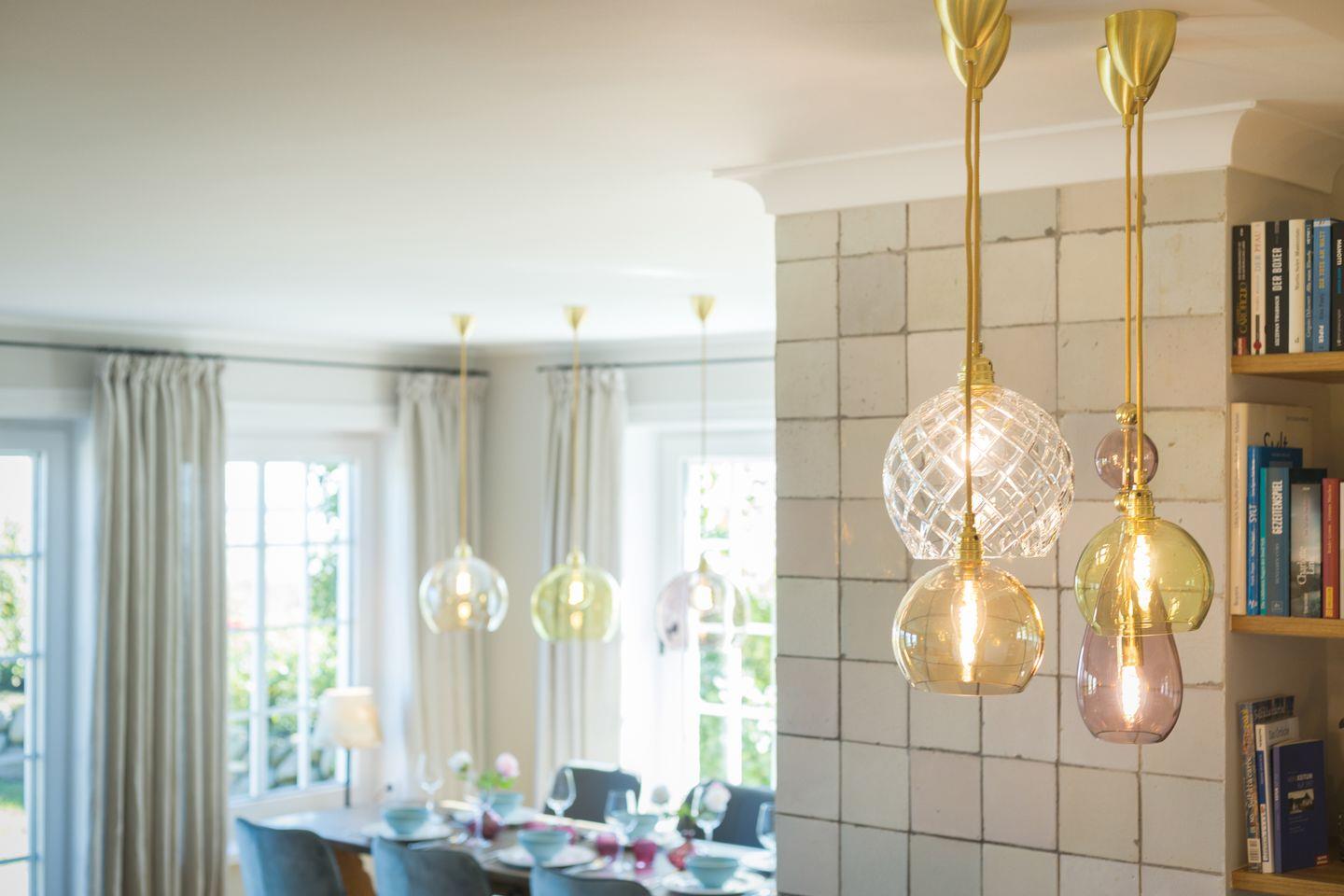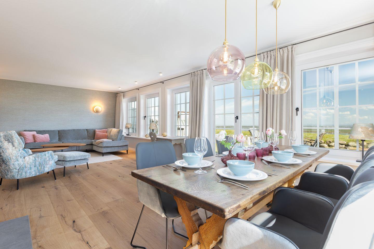 Wohn-/Essbereich: großer, heller Raum mit Dielenboden, offenem Kamin und traumhaftem Blick über das Wattenmeer, großzügige Couch mit Flat-TV; Essbereich mit großem Tisch und sechs Stühlen.