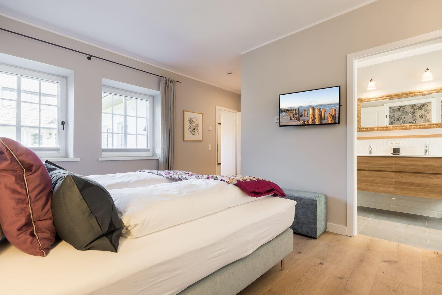 Schlafzimmer mit Doppelbett (2 Matratzen á 100 x 200 cm, ohne Fußende) und Bad en-suite mit Dusche / WC, Doppelwaschbecken, großem Spiegel und Kosmetikspiegel