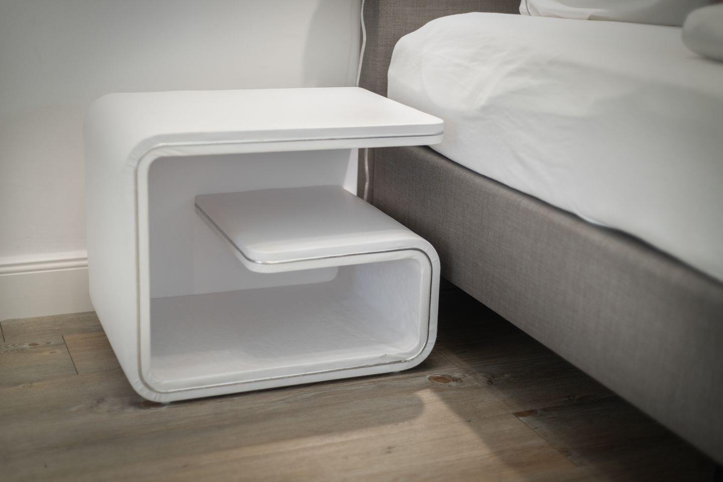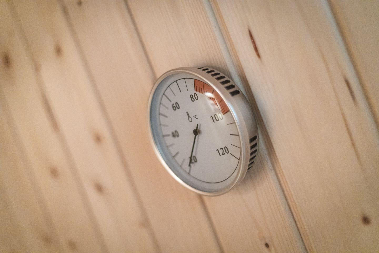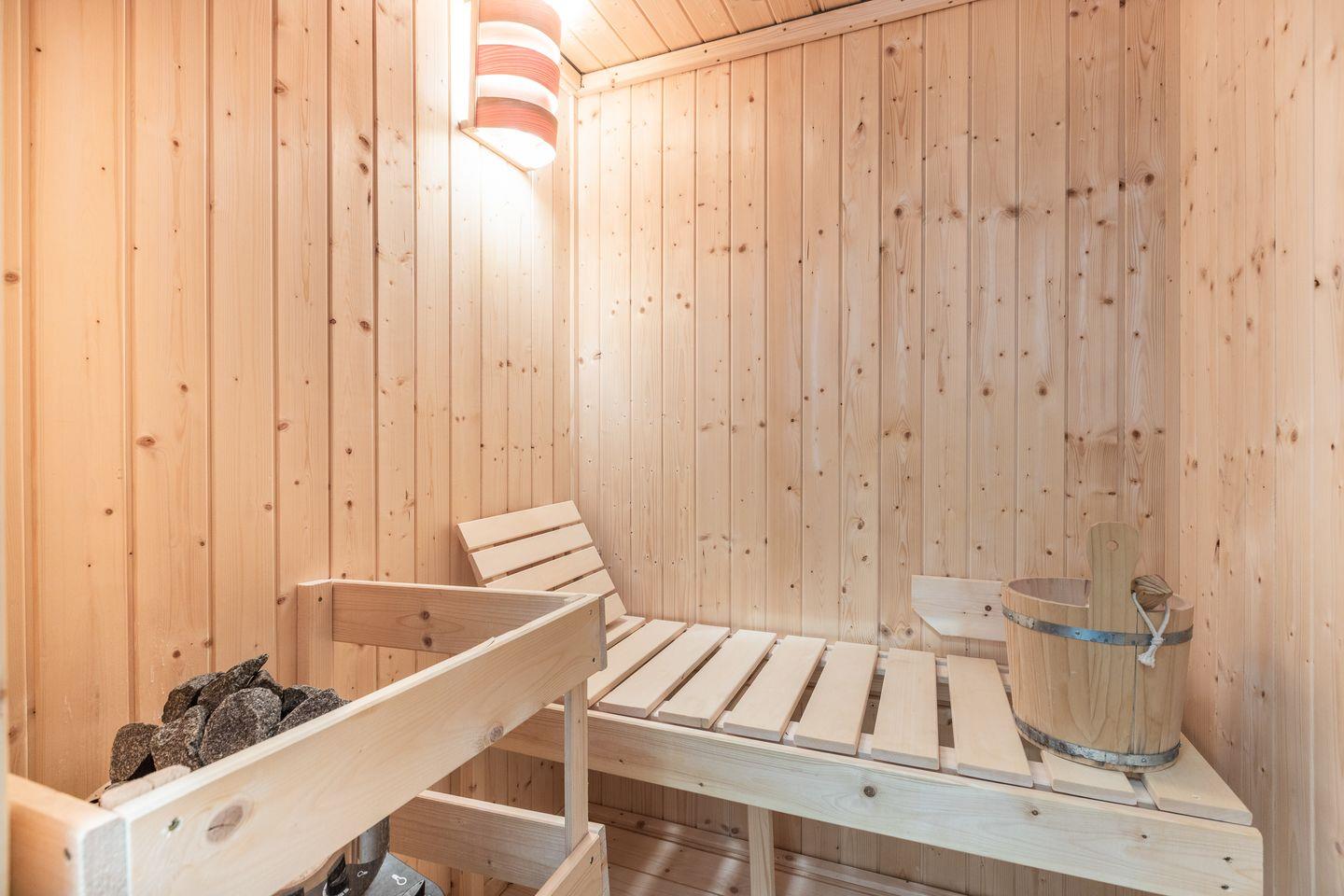 Sauna: Saunazimmer mit Entspannungsstuhl und Sideboard