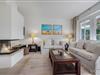 Wohn-/Essbereich: Wohnraum mit heller Sitzgarnitur bestehend aus zwei 2er-Couchen und einem Sessel, Kamin und Plasma-TV mit Stereoanlage (DVD etc.), zur offenen Küche steht der eckige Esstisch mit sechs Stühlen