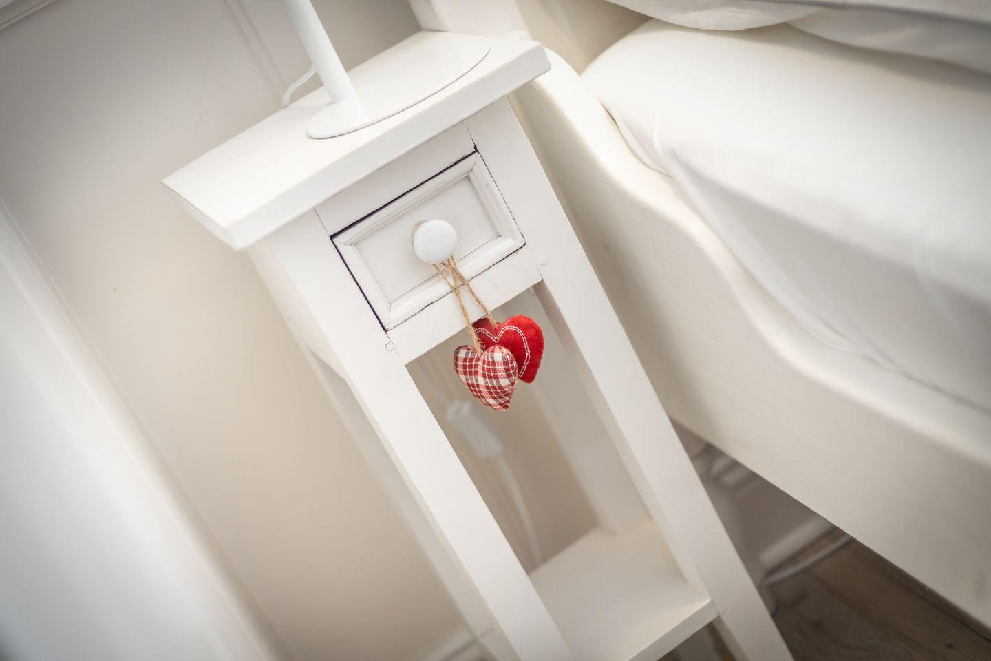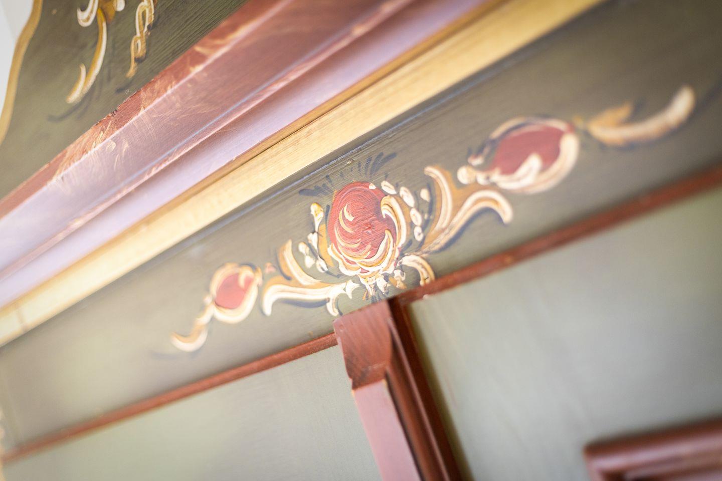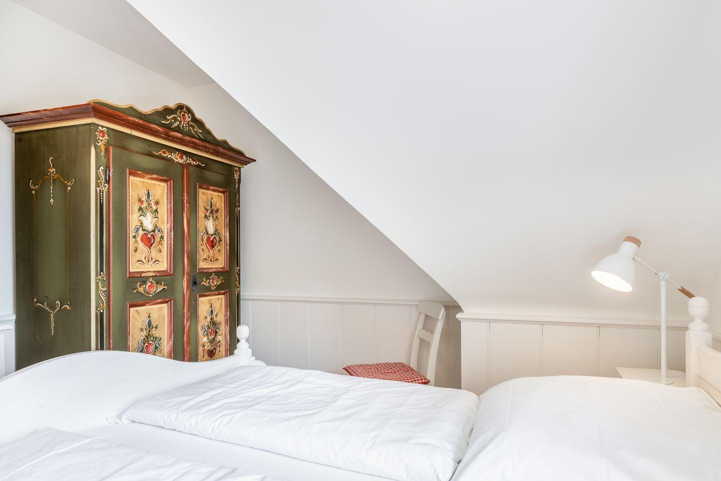 Schlafen 1: kleiner Schlafraum mit Doppelbett (Fußteil) und Bauernschrank
