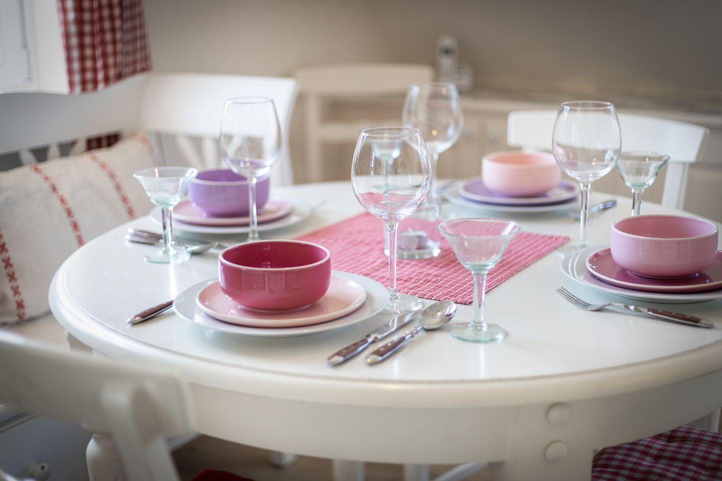 Wohn-/Essbereich: heller Raum mit großer Couch, Sessel und Fußteil, runder Esstisch mit drei Stühlen und kleiner Sitzbank