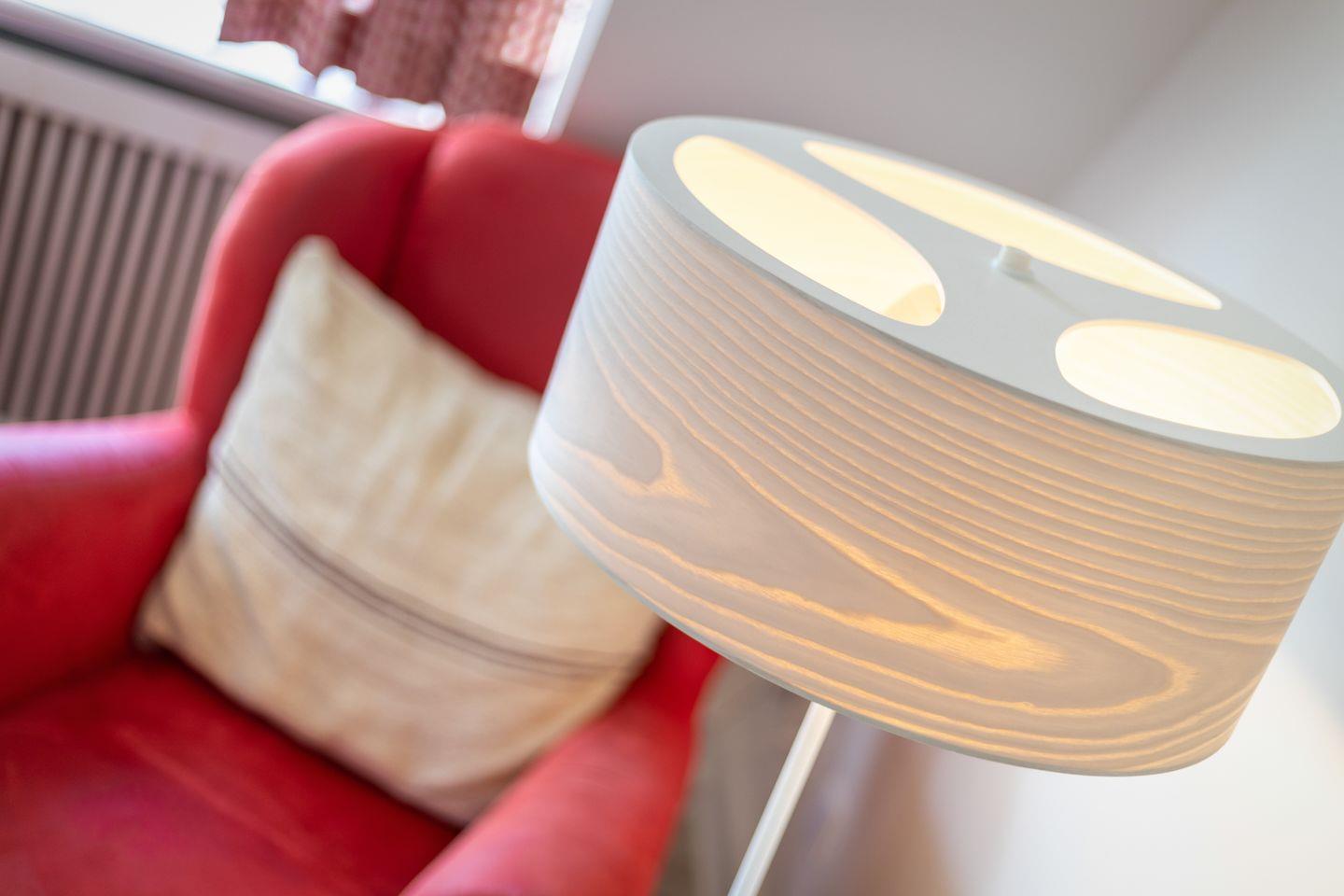 Flur 2: aus dem Vorflur geht eine offene Treppe in einen zweiten Flur mit Einbauten und Sessel