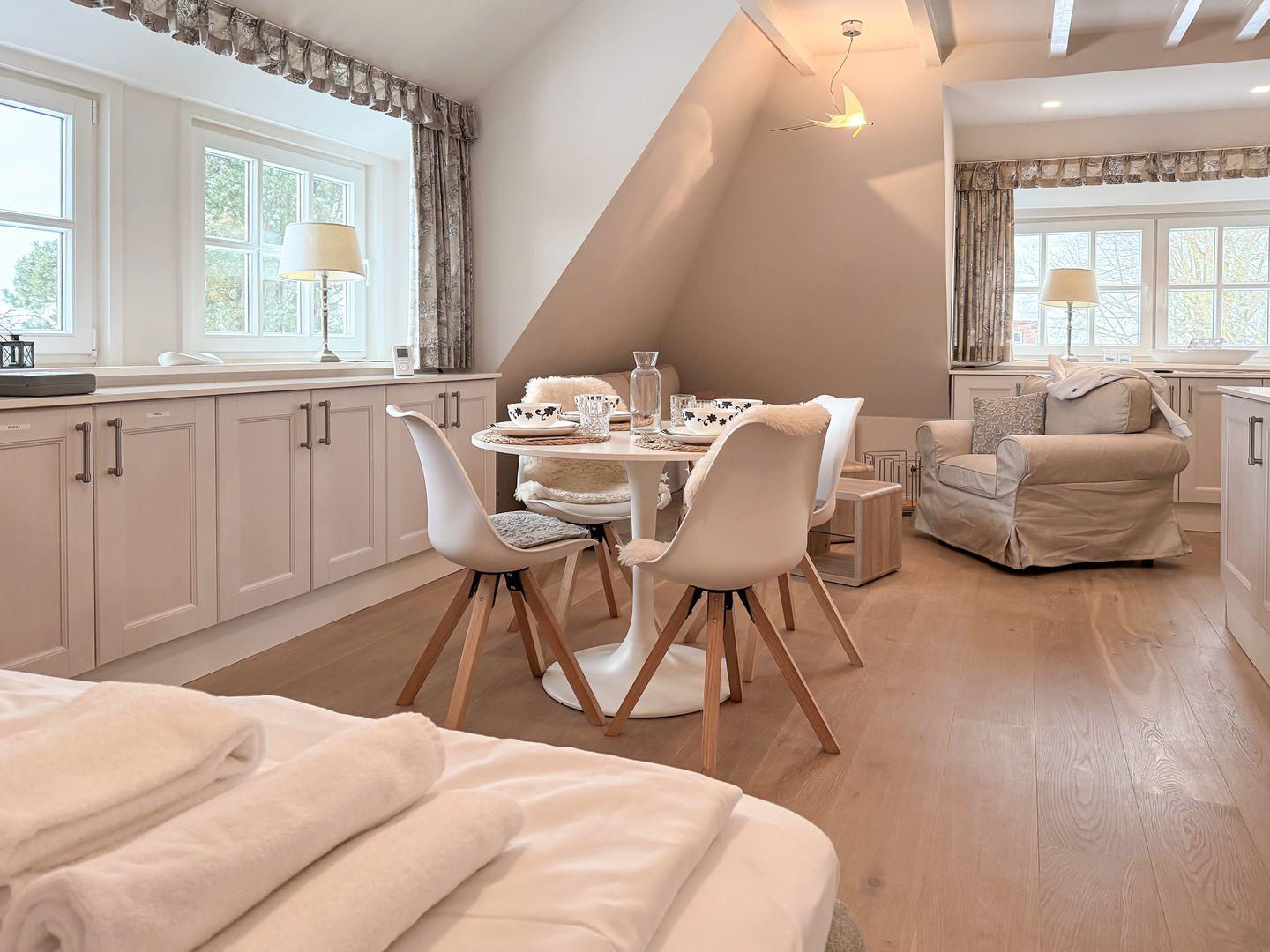 Das Apartment Juwel in Keitum auf Sylt bietet auf 43 m² im 1. Stock Platz für 2 Personen. Genießen Sie einen offenen Wohnbereich mit integrierter Küche, Essbereich und Schlafbereich. Der Ort Keitum lädt ein für ausgedehnte Spaziergänge, auch entlang am Wattenmeer.