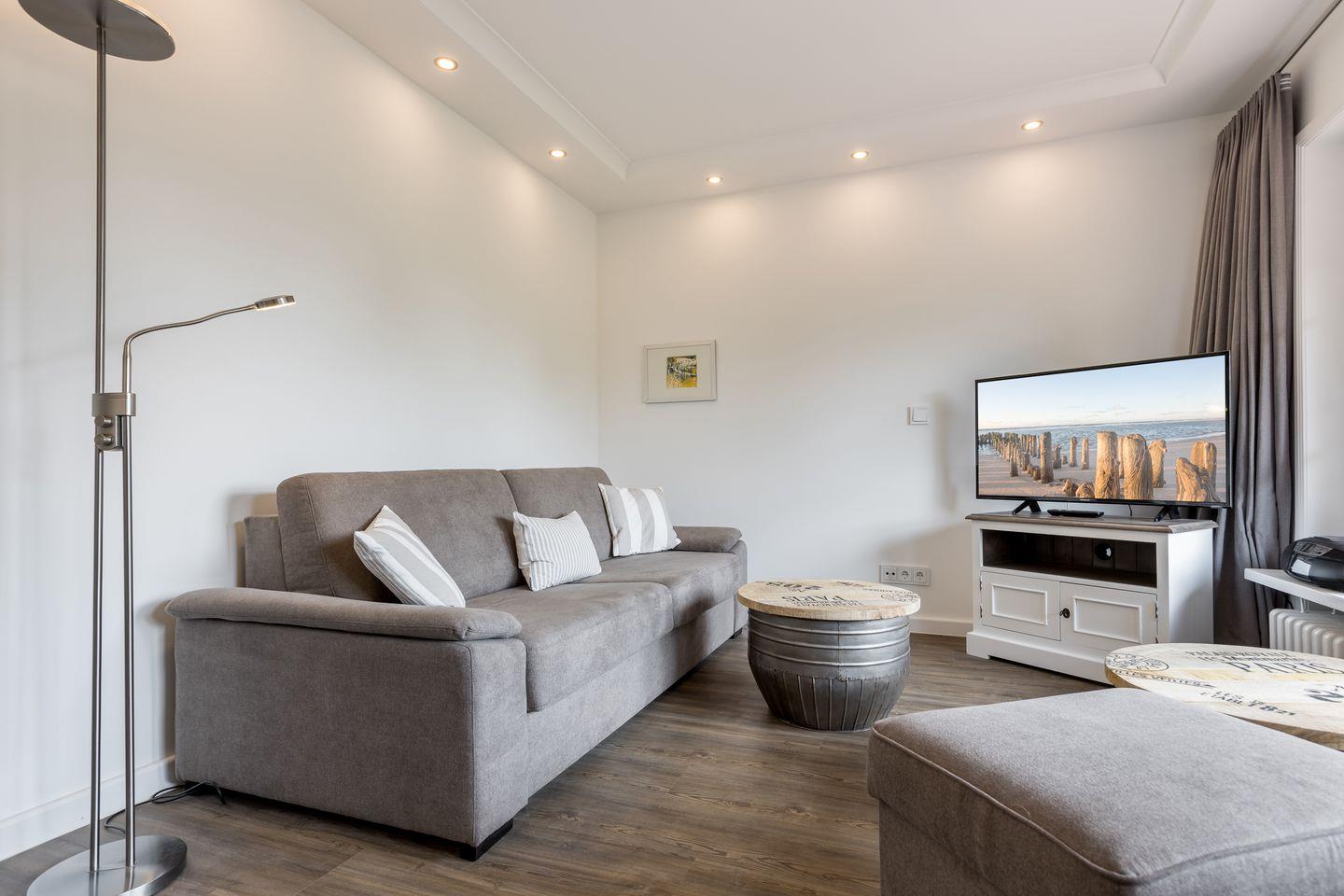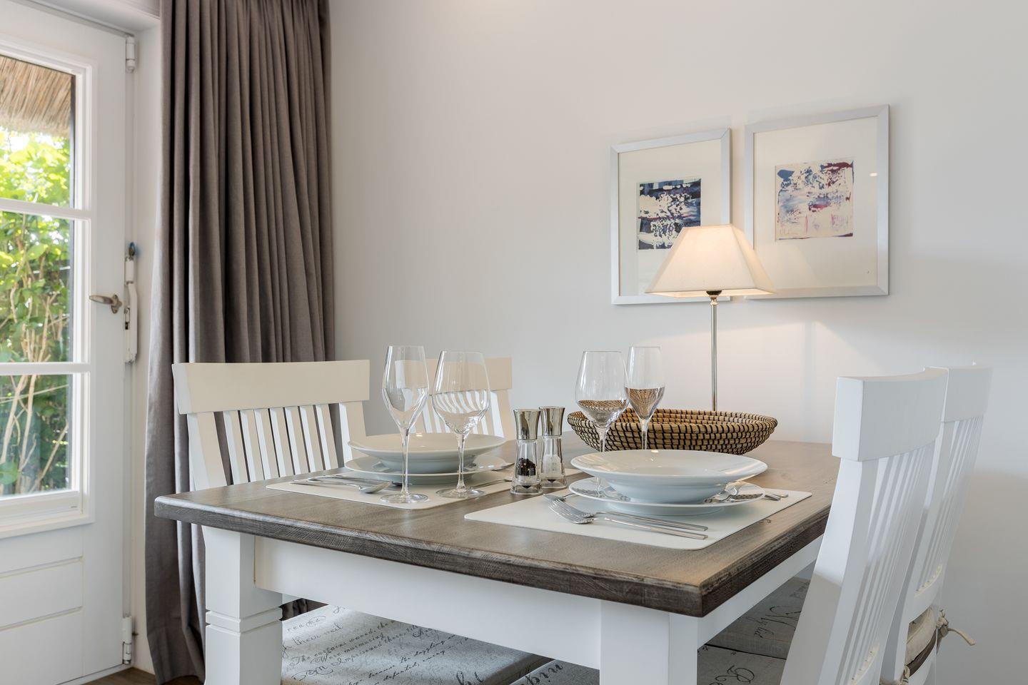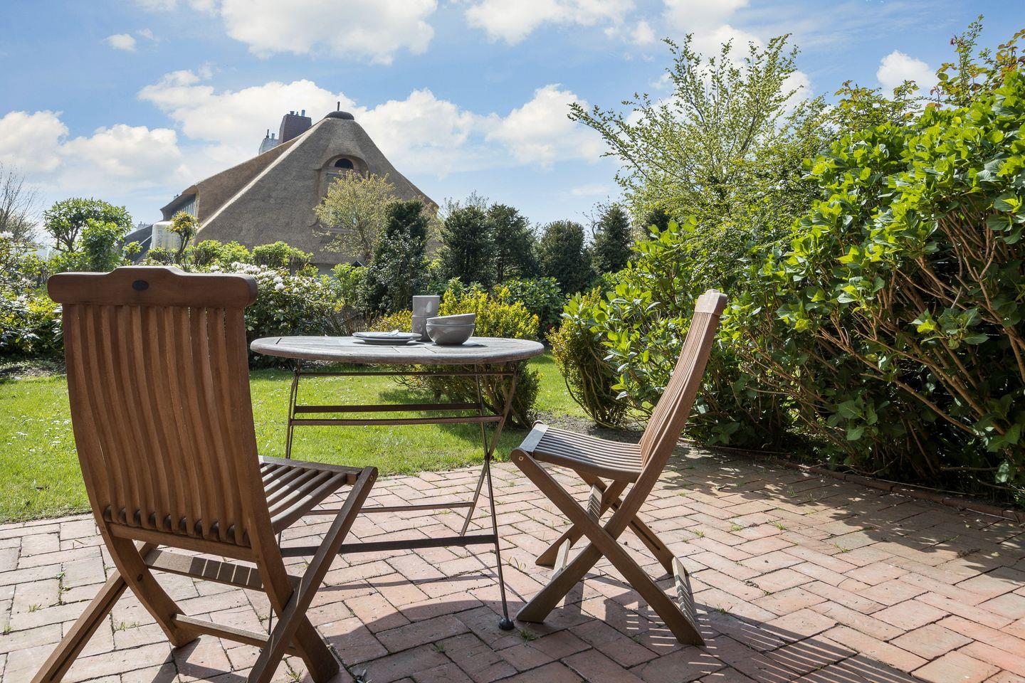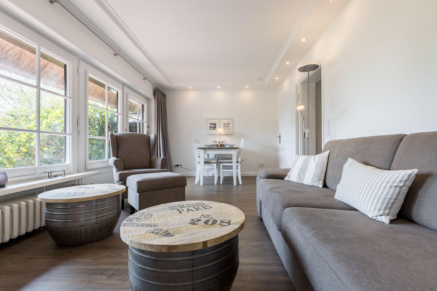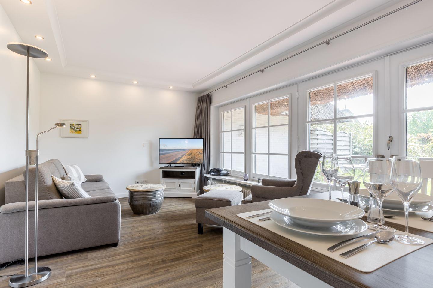 In einer reetgedeckten Wohnanlage in Südlage nahe dem Benen-Diken-Hotel.