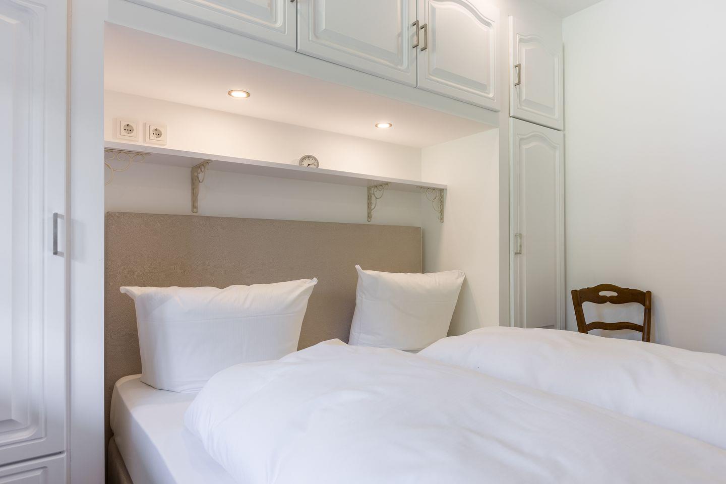 Schlafen: hübscher Schlafraum mit Doppelbett (160 x 190 cm) ohne Fußteil und Einbauschrank
