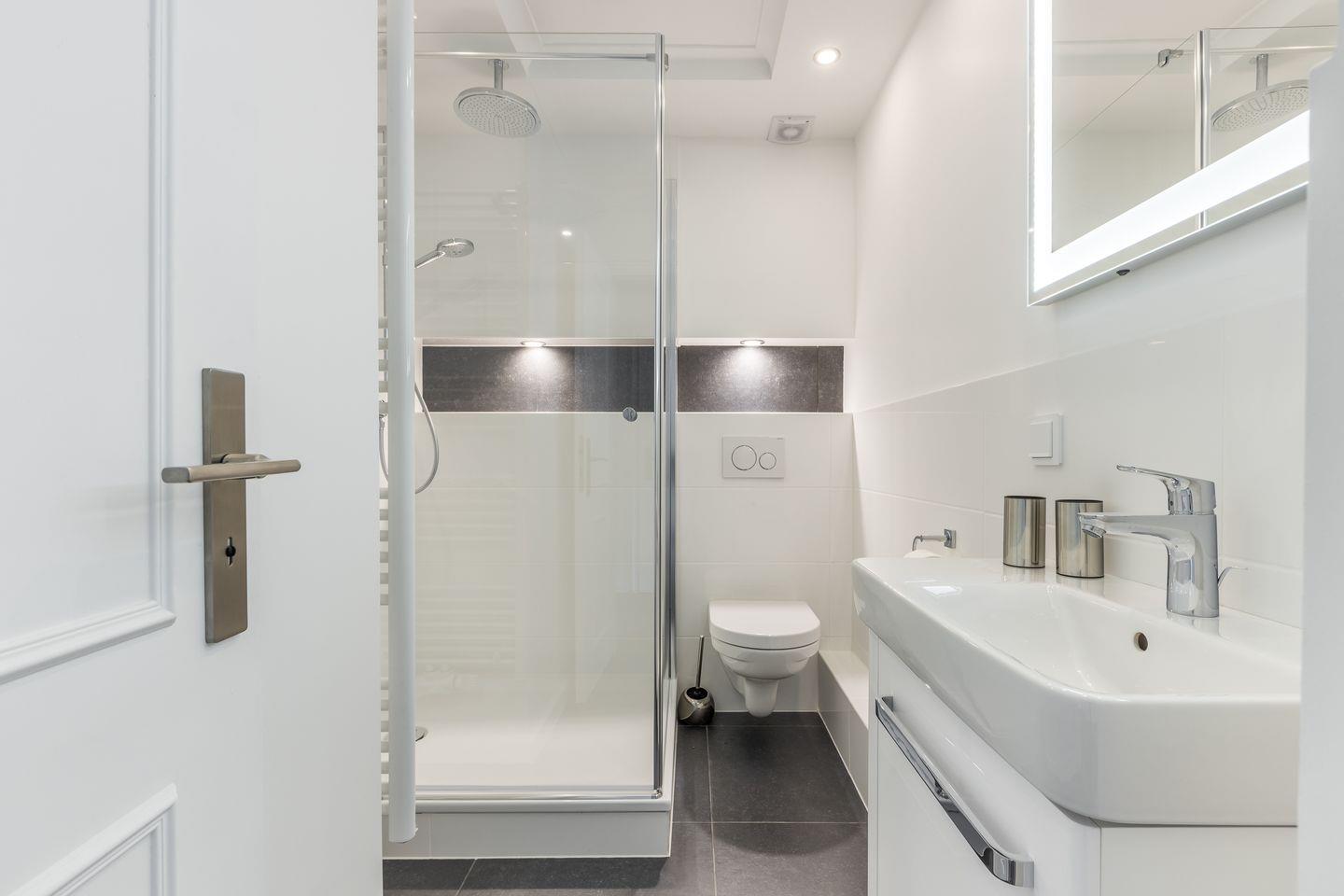 Bad: weißes Duschbad mit Runddusche / WC und elektrischem Handtuchwärmer