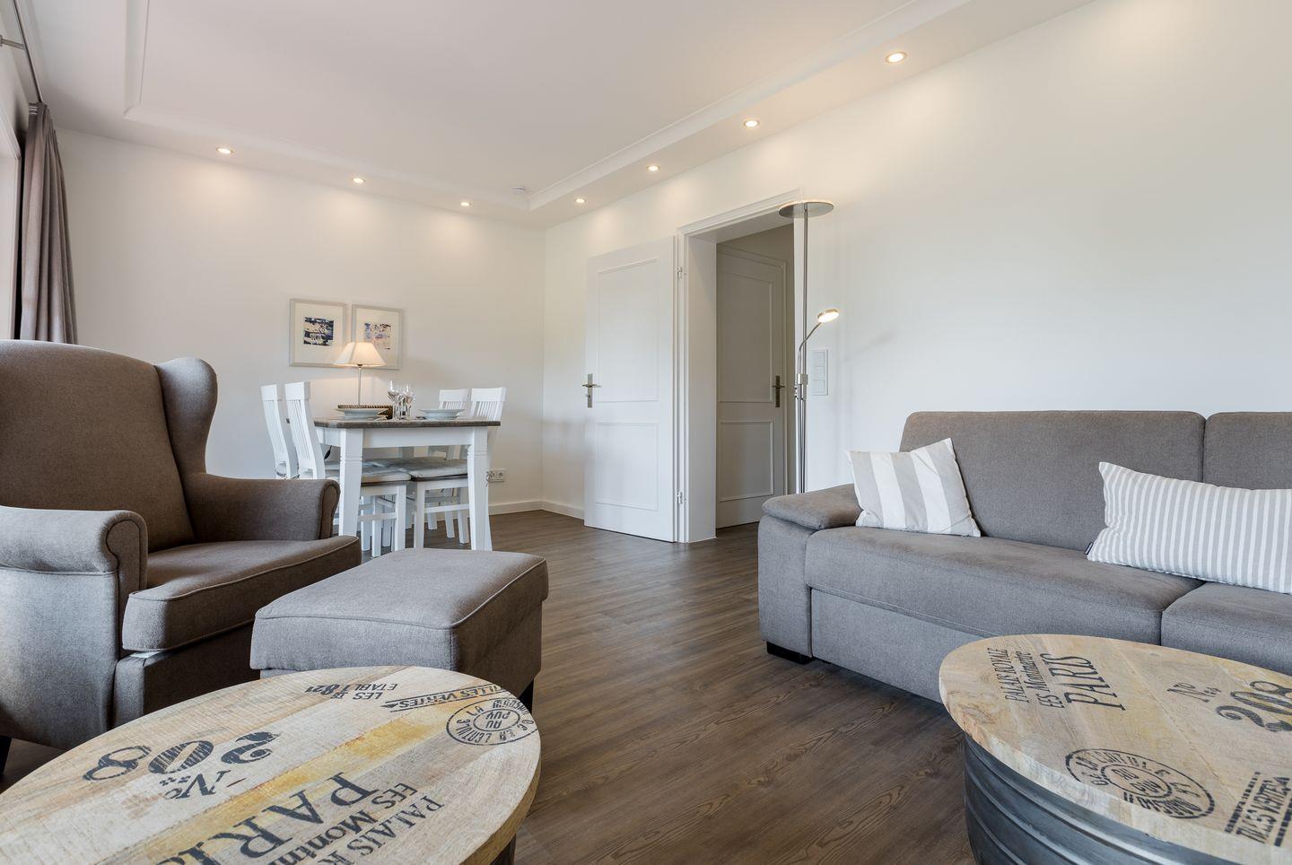Wohn-/Essbereich: heller Wohnraum mit gemütlicher Sitzecke (Eckcouch und Sessel) sowie einer Schrankwand mit eingearbeitetem Esstisch