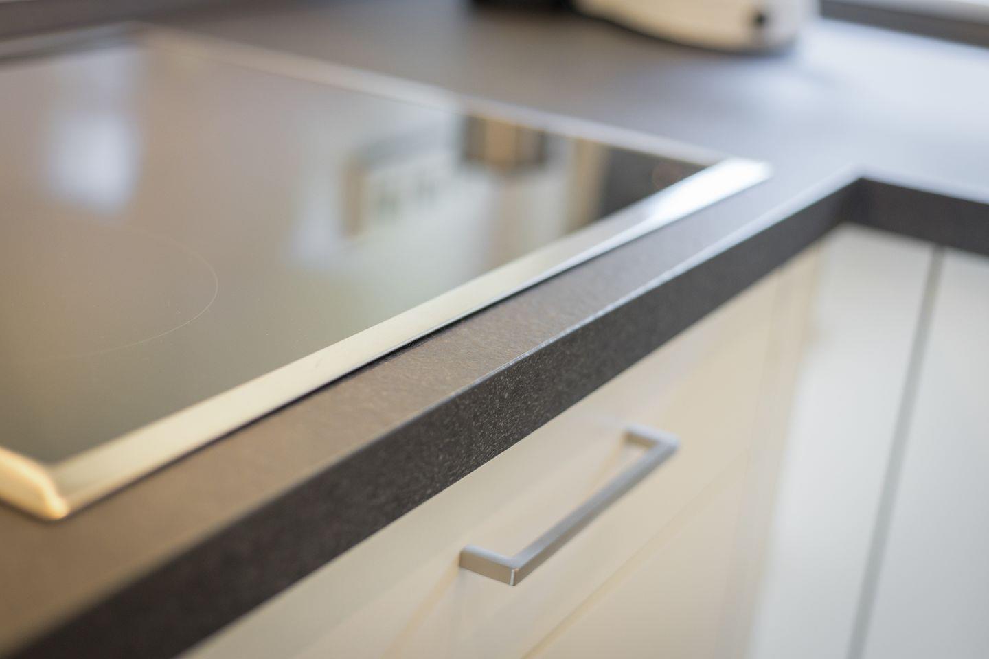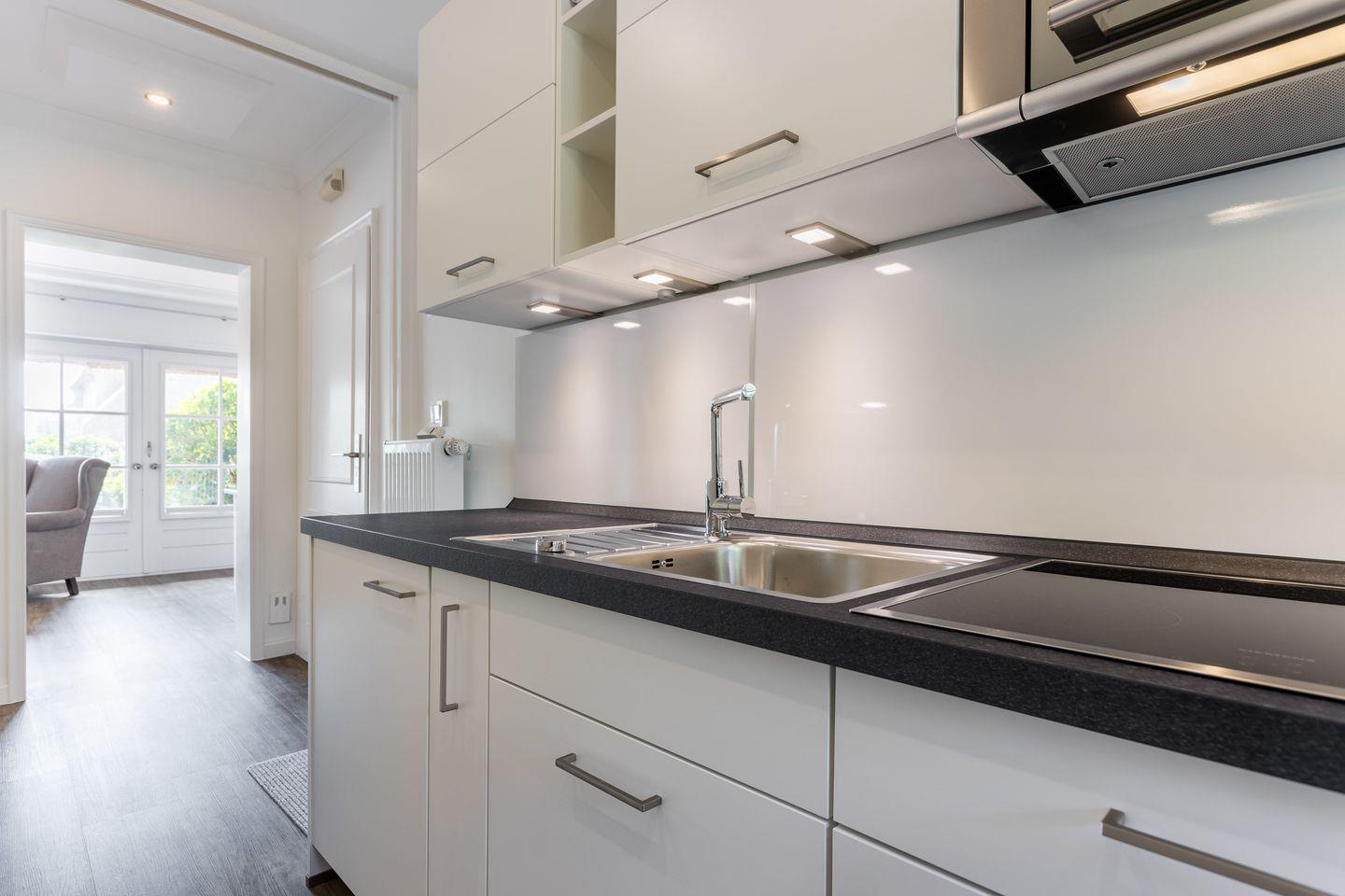 Küche: zum Flur offene kleine Küche mit Geschirrspüler und Cerankochfeld