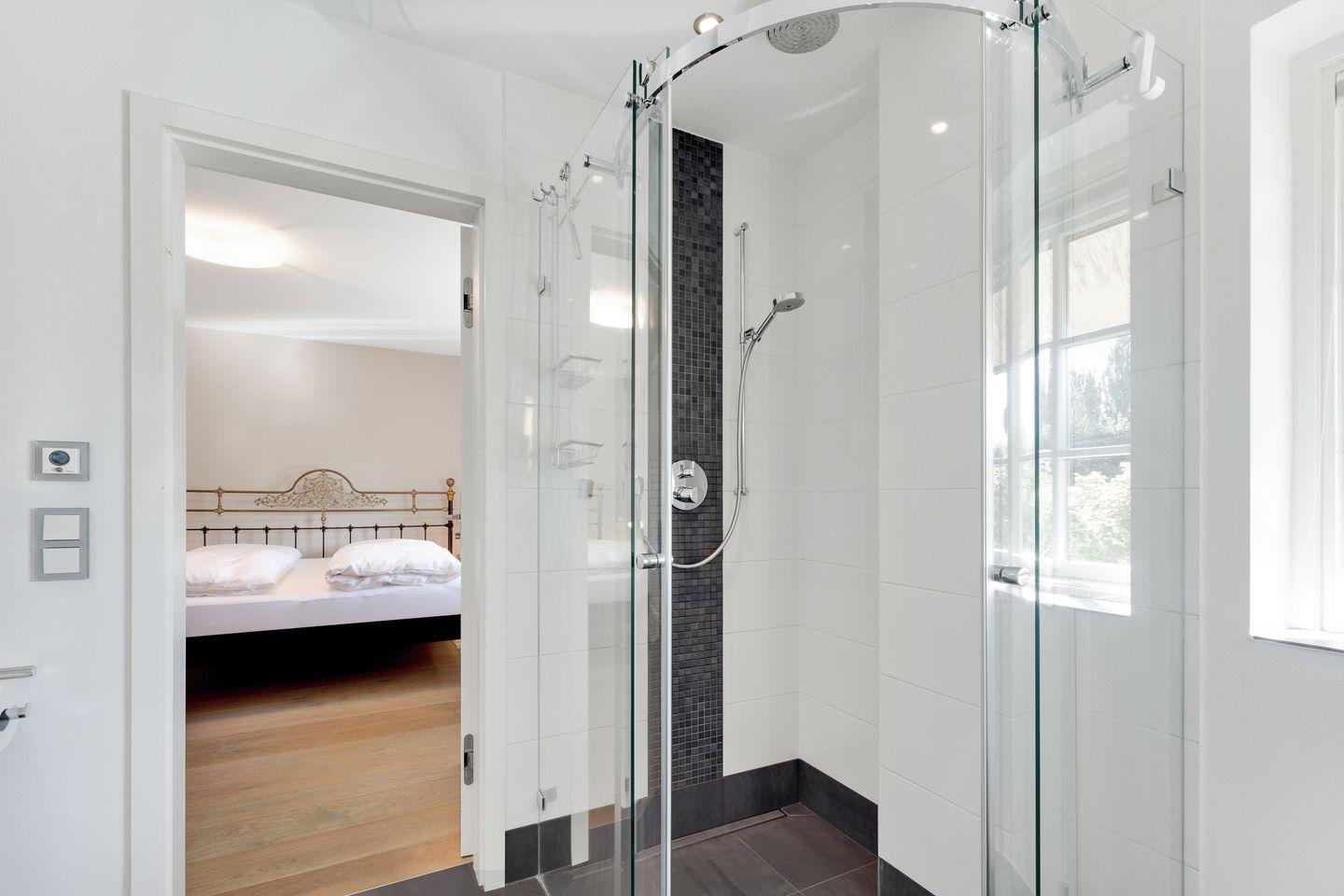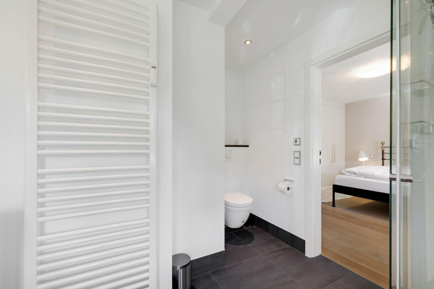 Badezimmer: Granit Bad mit ebenerdiger Dusche, elektrischem Handtuchhalter,