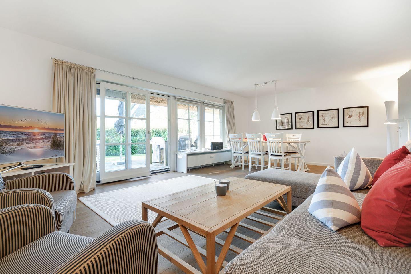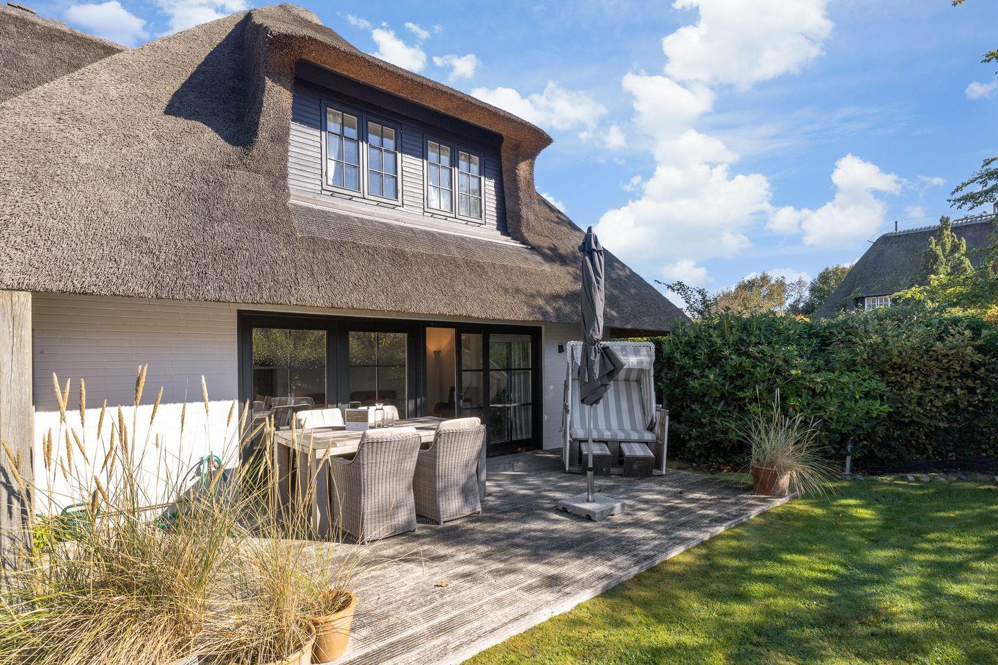Die hier vorgestellte, sonnige Ferienwohnung im Erdgeschoss ist ca. 75 m² groß und bietet zwei Personen großzügigen Platz. Die Wohnung liegt in einer reetgedeckten Wohnanlage mit einer Terrasse in Südwestlage. In der Anlage befinden sich acht Eigentumswohnungen. Die stilvolle, moderne Einrichtung zum Wohlfühlen bietet Ihnen auf einer Ebene jeglichen Komfort wie Flat-TV, WLAN, Stereoanlage mit CD, Fön, Geschirrspüler, 2 Cerankochfelder, Mikrowellen-Backofen, Waschmaschine und Pkw-Stellplatz.