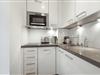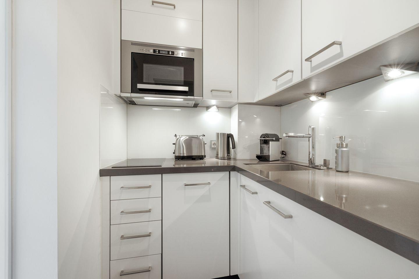 Küche: separate kleine Einbauküche mit Geschirrspüler, 2 Plattenherd und Mikrowellen-Backofen