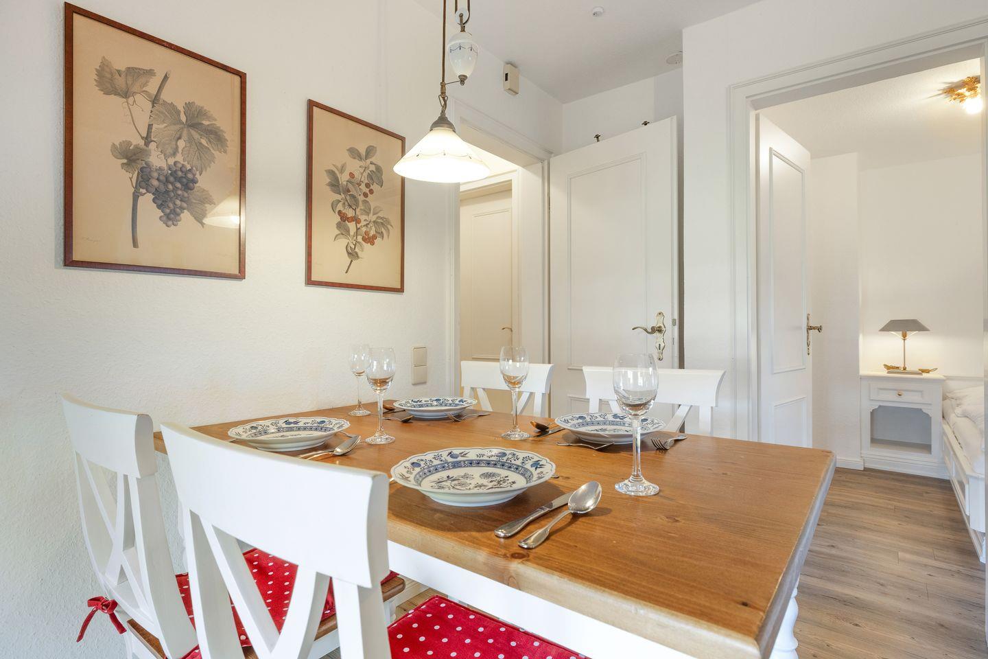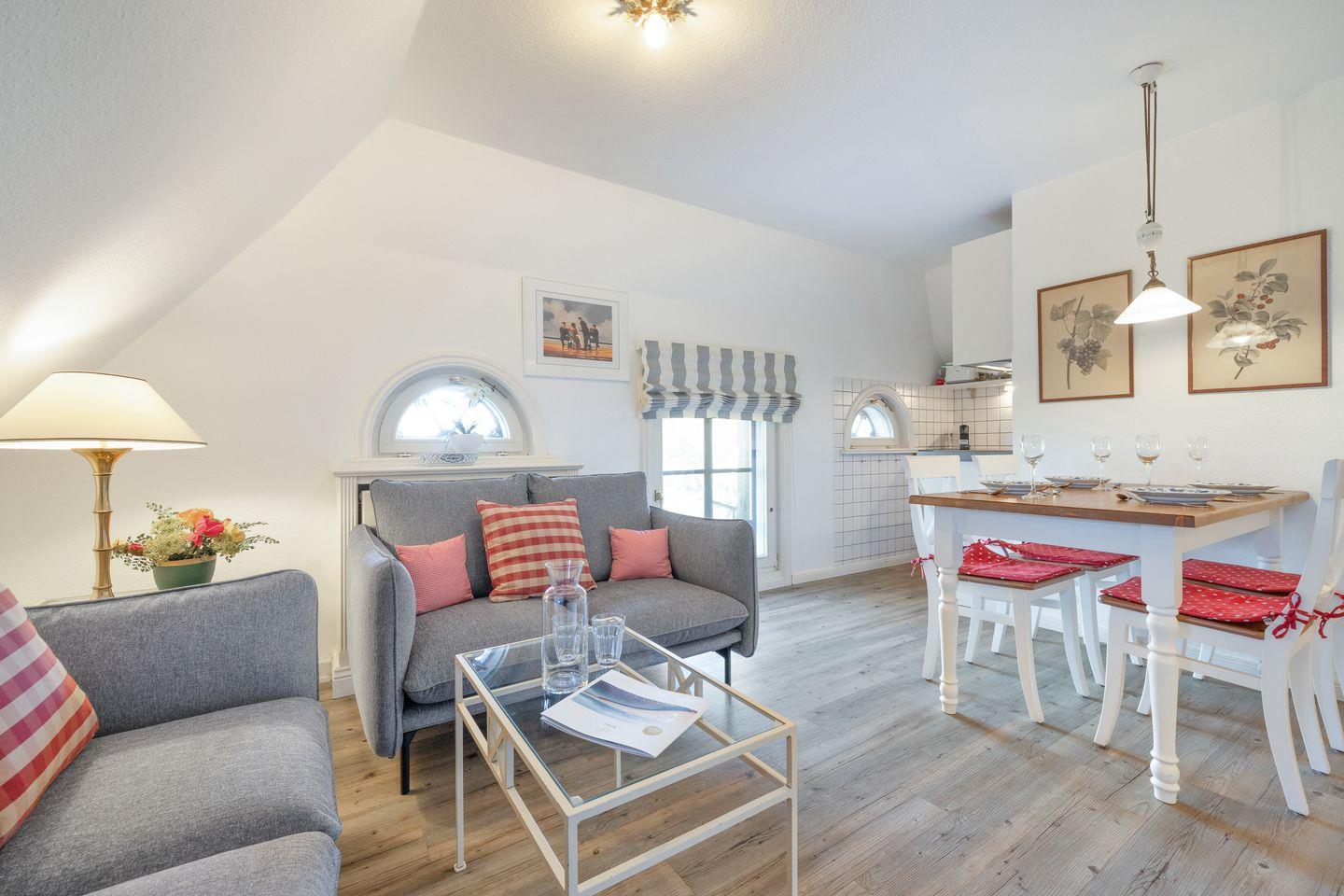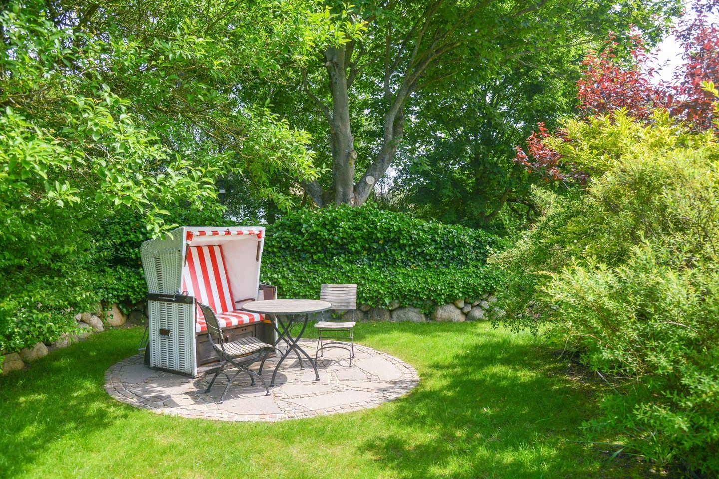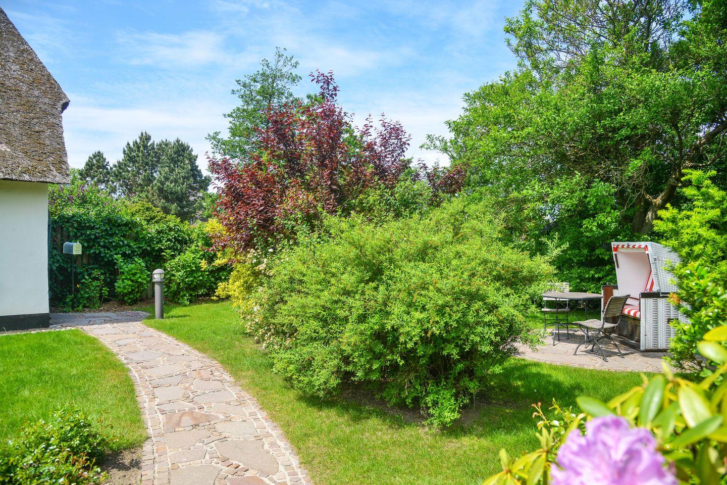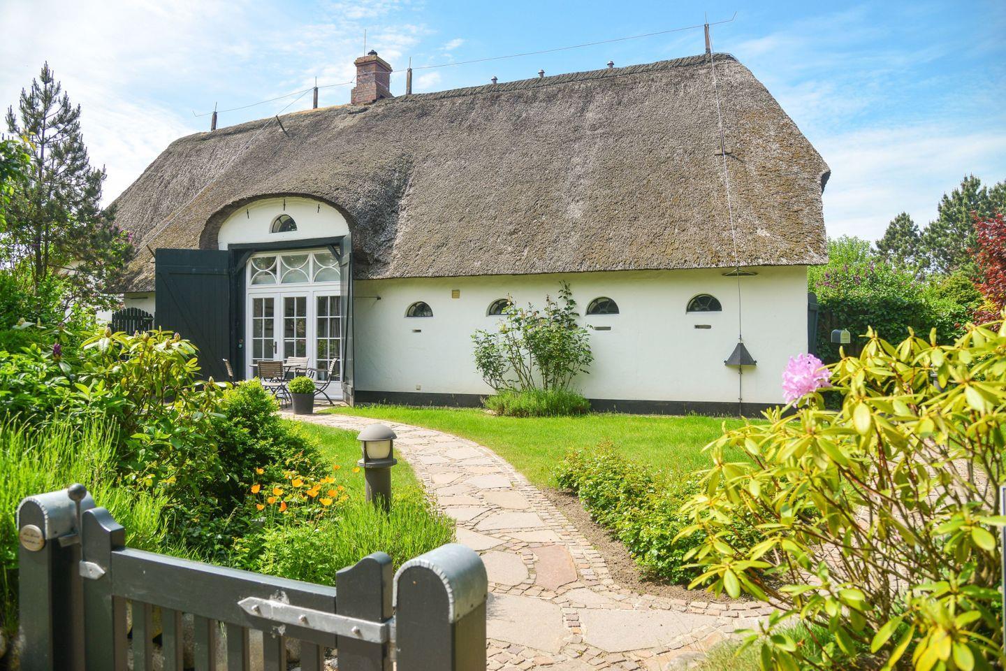 Das reetgedeckte, gepflegte Haus liegt im Süden von Keitum. Die helle Einrichtung mit Tischlereinbauten ist gemütlich und liebevoll gestaltet. Die Wohnung bietet Komfort wie Flat-TV, W-LAN, Stereoanlage mit CD, Induktions-Kochfeld, Mikrowellen / Backofen Kombi, Geschirrspüler, Waschtrockner und Gartenplatz mit Strandkorb und Gartenmöbeln (ca. April - Oktober )
