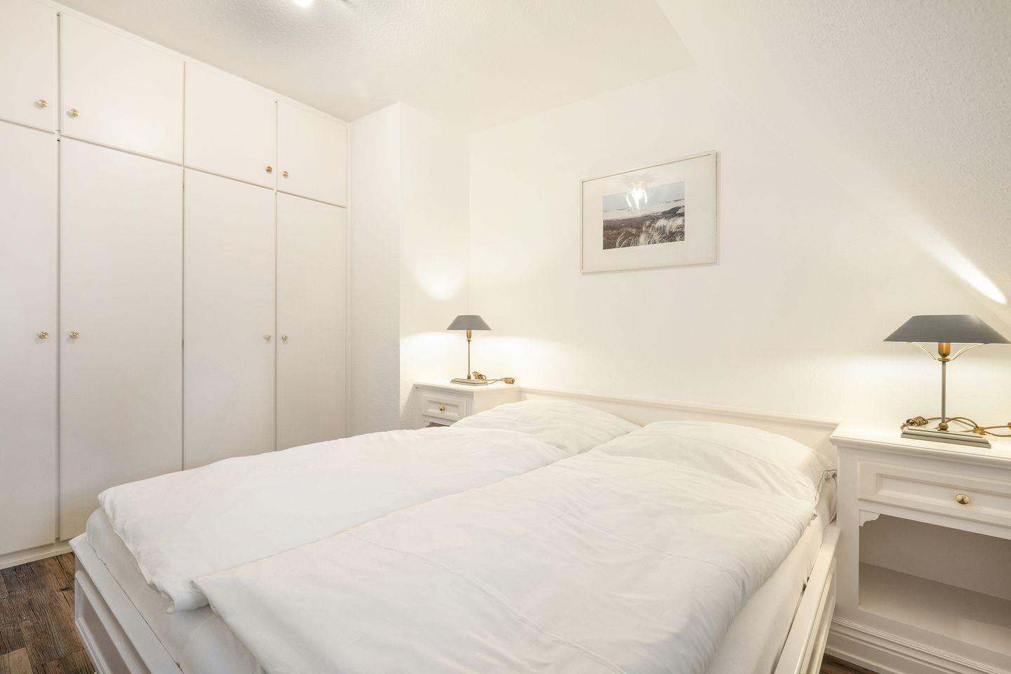 Schlafen 2: Schlafraum mit Doppelbett (2 Matratzen á ca. 80 x 190 cm, ohne Fußteil) und Einbauschrank