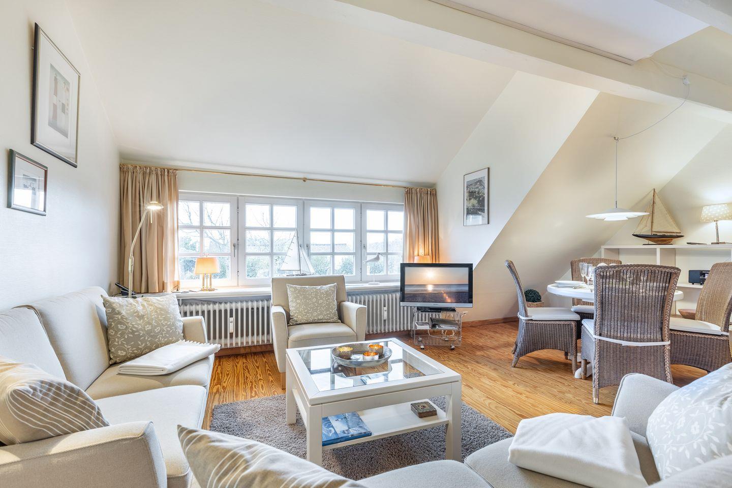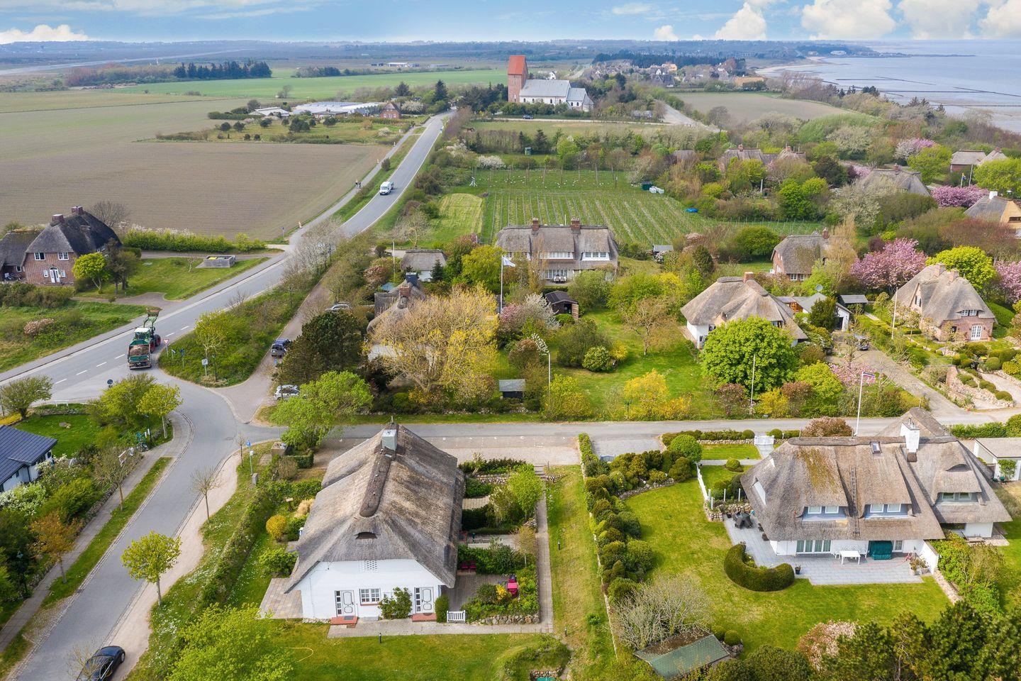 Die liebevoll ausgestattete Obergeschoss-Wohnung unter Reet befindet sich im Norden Keitums. Der Ort gilt als das „grüne Herz Sylts“ und ist geprägt durch Baumalleen, malerische Gärten und traditionelle Friesenhäuser. Das Wattenmeer und eine Einkaufsmöglichkeit sind in wenigen Gehminuten zu erreichen.
