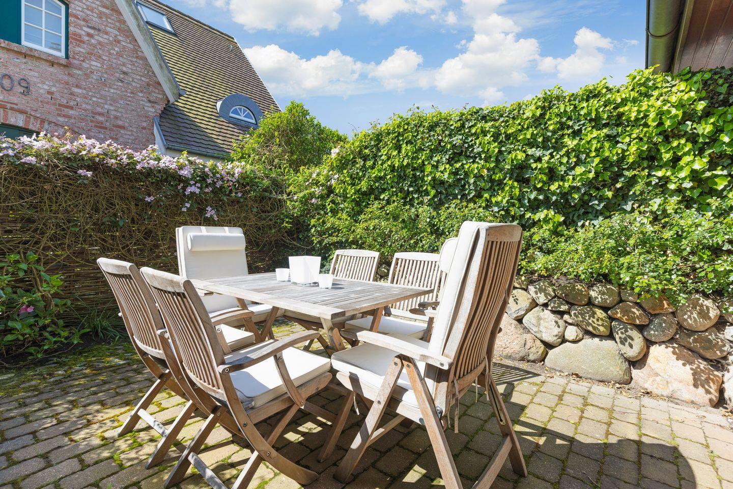 Im Sommer lädt die nach Süden ausgerichtete Terrasse (20qm) mit Teak-Gartenmöbeln zum Verweilen ein. In der kalten und stürmischen Jahreszeit wartet der gemütliche Kamin nach einem ausgedehnten Spaziergang und hilft beim Wiederaufwärmen.