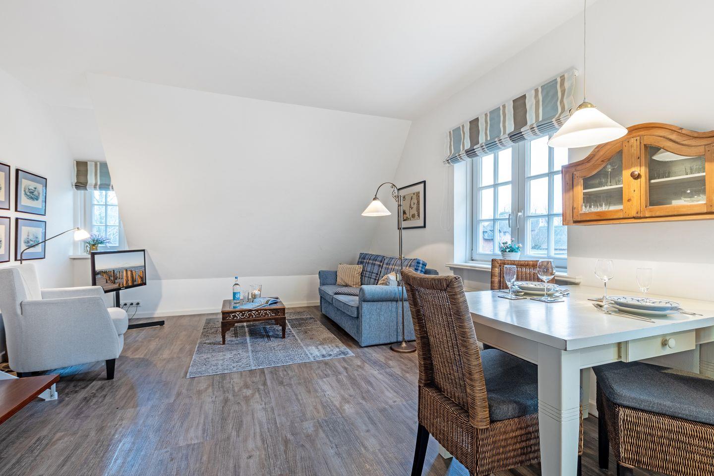 Freundlicher und heller Wohnraum im Obergeschoss, im Wohnzimmer sind TV und Radio (WLAN vorhanden)